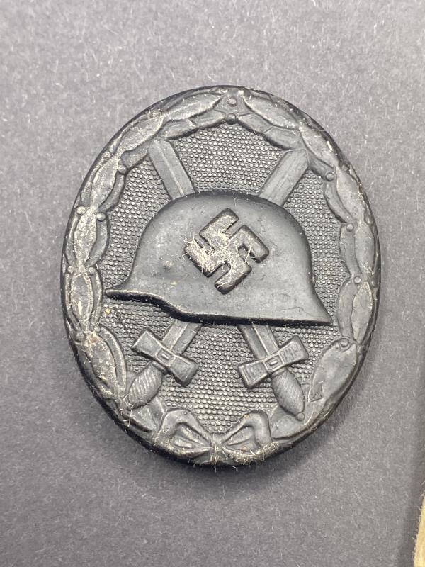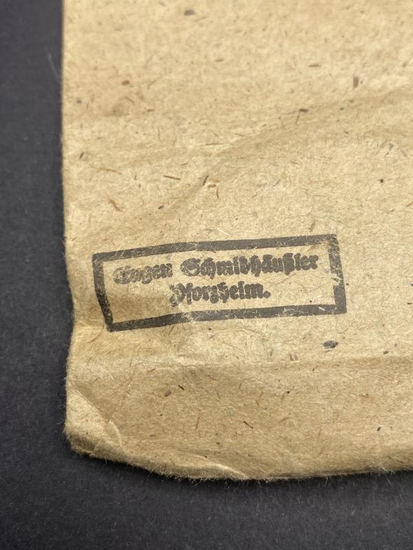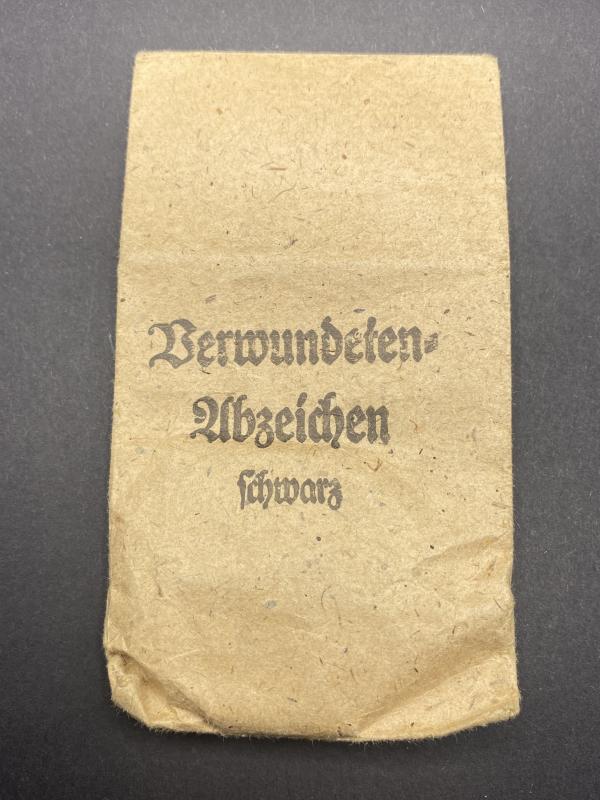 Original unissued Black grade wound badge produced by Eugen Schmidthaussler. Award complete with original paper packet. Badge marked E.S.P. Badge may have traces of paper on it due to storage. A nice item. Rarely found in the packet.