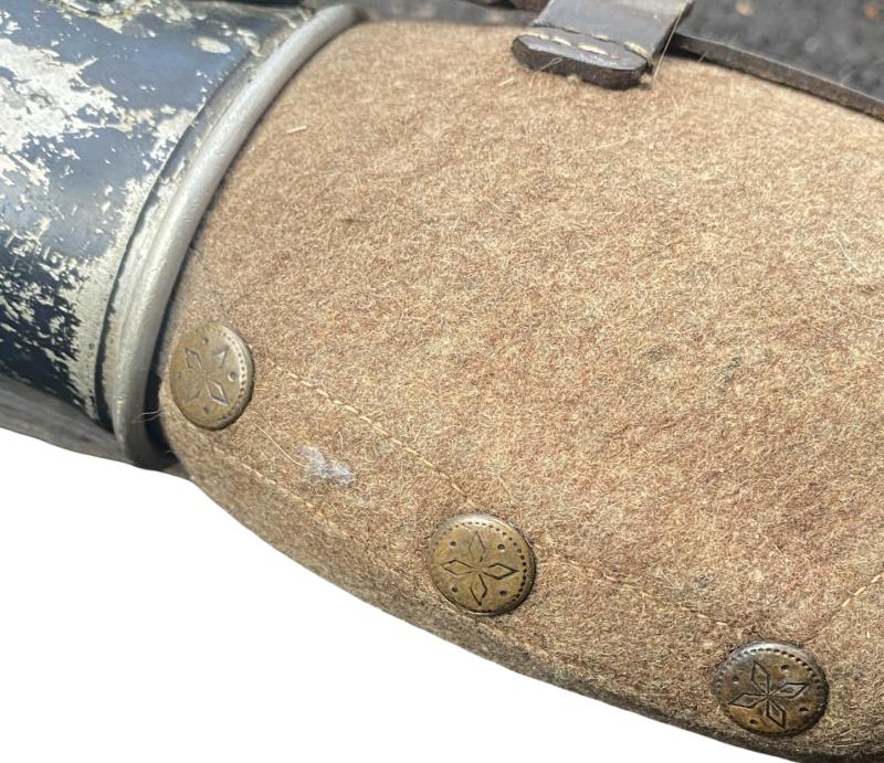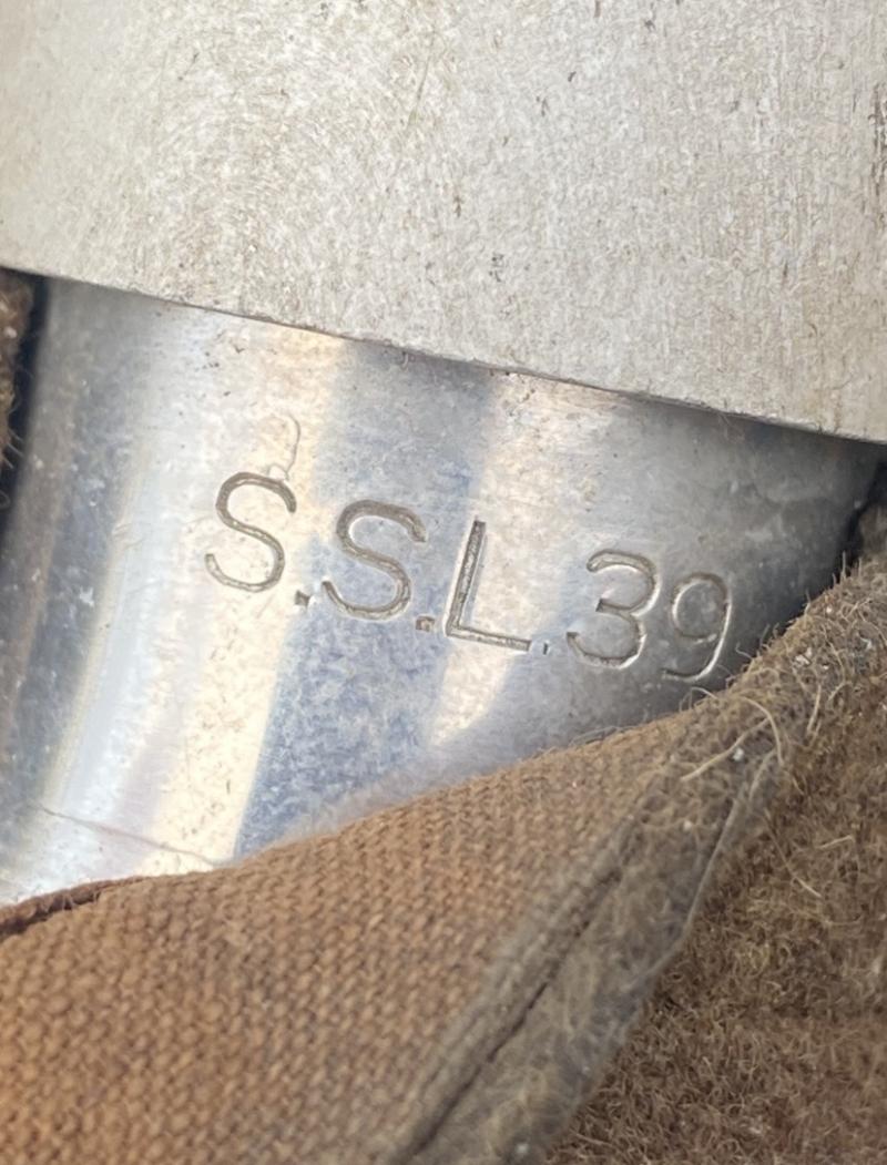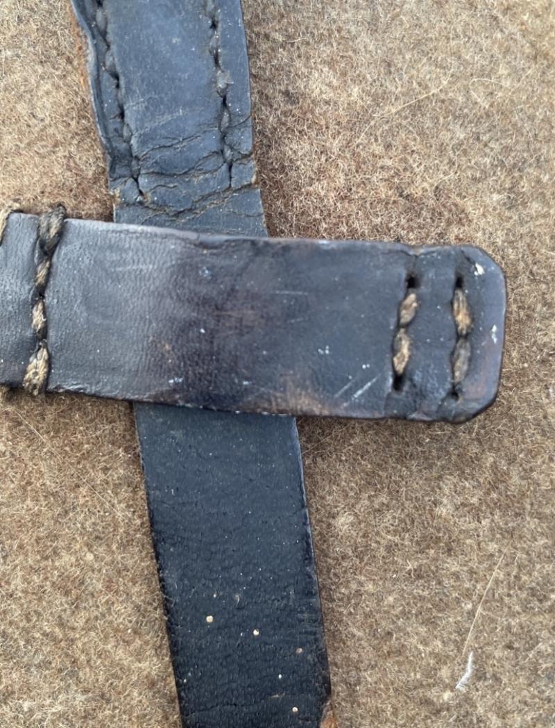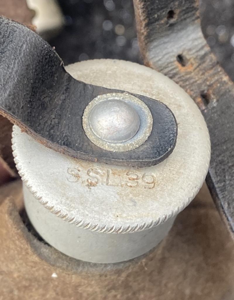 Original German army canteen set, fully matching codes and years. The cup, cap and bottle all marked SSL39. Leather is nice and soft, no moth nip to the felt cover. Complete with clip on the reverse to attach to webbing. The front of the bottles leather tab has come away, however easily fixed by resewing or fabric glue.