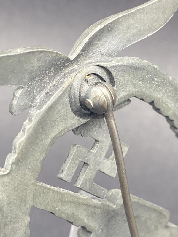 Original Luftwaffe Flak badge produced by an unknown maker with characteristics of the Gablonz makers. Award made of zinc, fitted with ball hinge. A very nice clean badge.