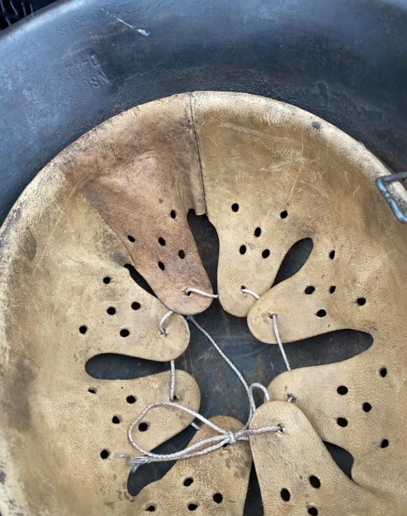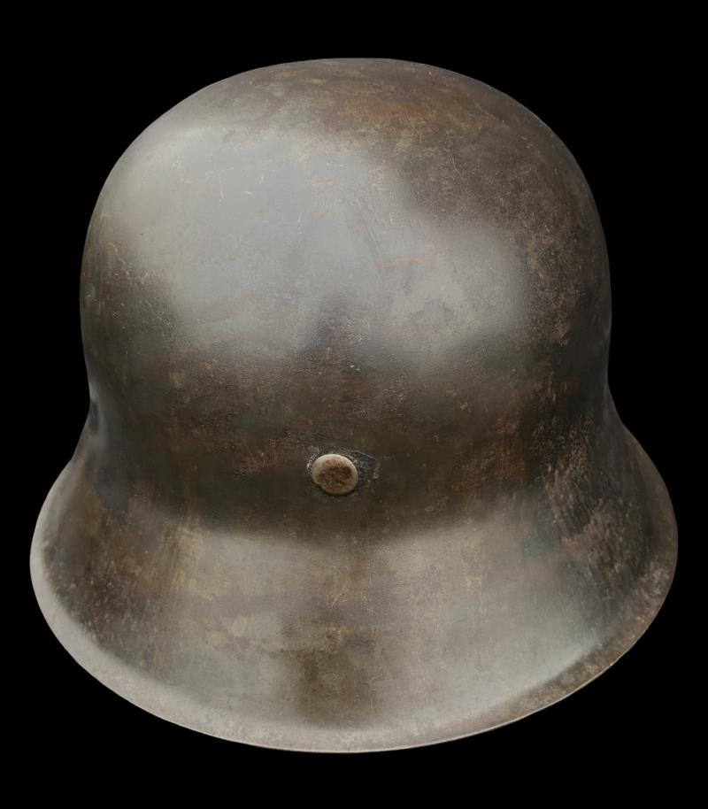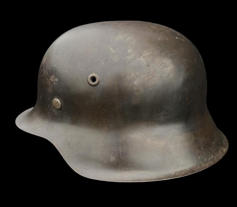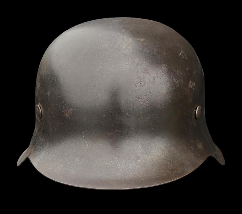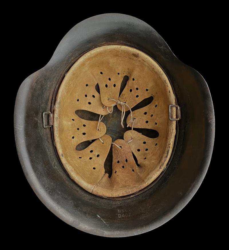 Original late war German M42 helmet complete with liner, shell marks in the rear of the neck NS64 with accompanying batch number of D462. Helmet in fairly good condition, complete with its factory paint however this has worn and a previous owner has laqoured the outer shell giving it a higher shine that it should have. The original factory stamp can be seen in the shell where the crown of the head would sit. This liner is in very good condition, attached to the correct liner band. Liner has had a replacement cord attached inside. Overall a very nice helmet, competitively priced!