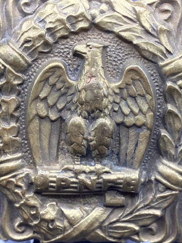 Original Fascist leaders belt buckle as worn by Mussolini’s PNF officers. Buckle is made of brass, in good condition. No makers mark present as standard with these buckles. High quality item.