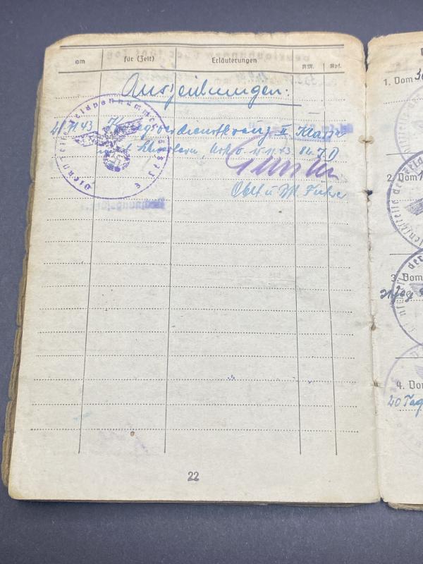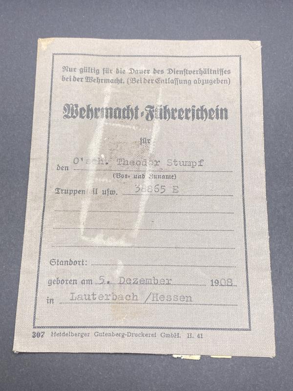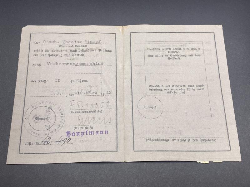 Original German army Soldbuch partially researched named to Theodor Stumpf, included with his Soldbuch is his army Fuhrerschein (Drivers License). His Unit Inf.Regt.158 was attached to the 82nd Infantry division who served in France, The Netherlands and USSR. Major offenoinclude the Battle of Kursk and Kiev Ukraine. Stumpf Earned the Merit Cross With Swords in second class. A nice original book with plenty of entries. Worthy of further research.