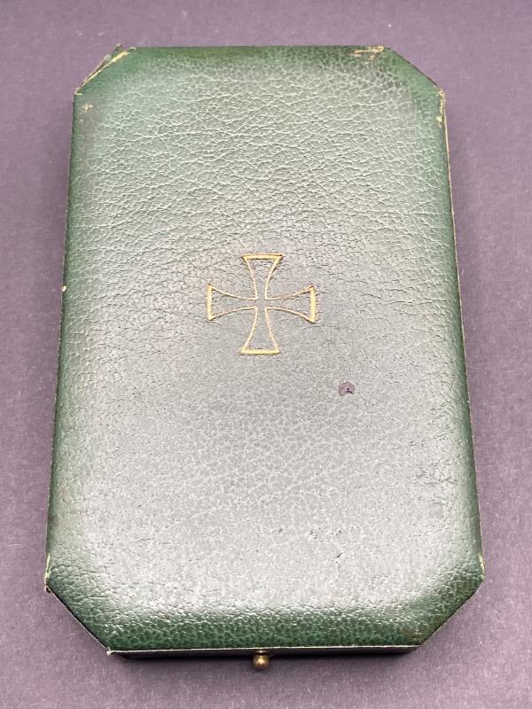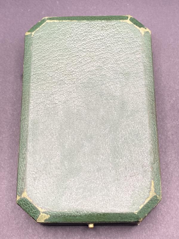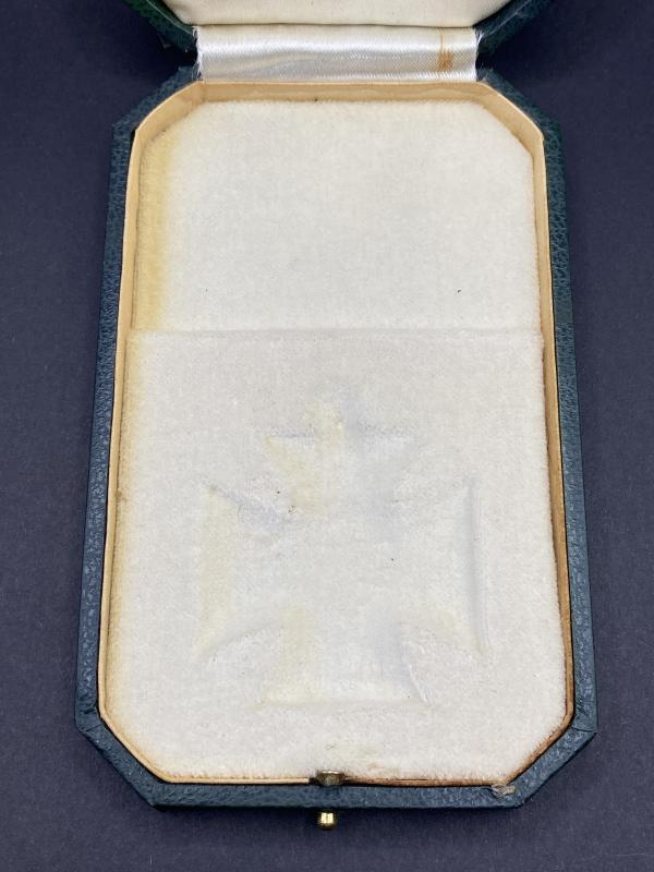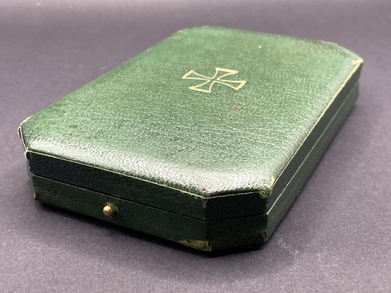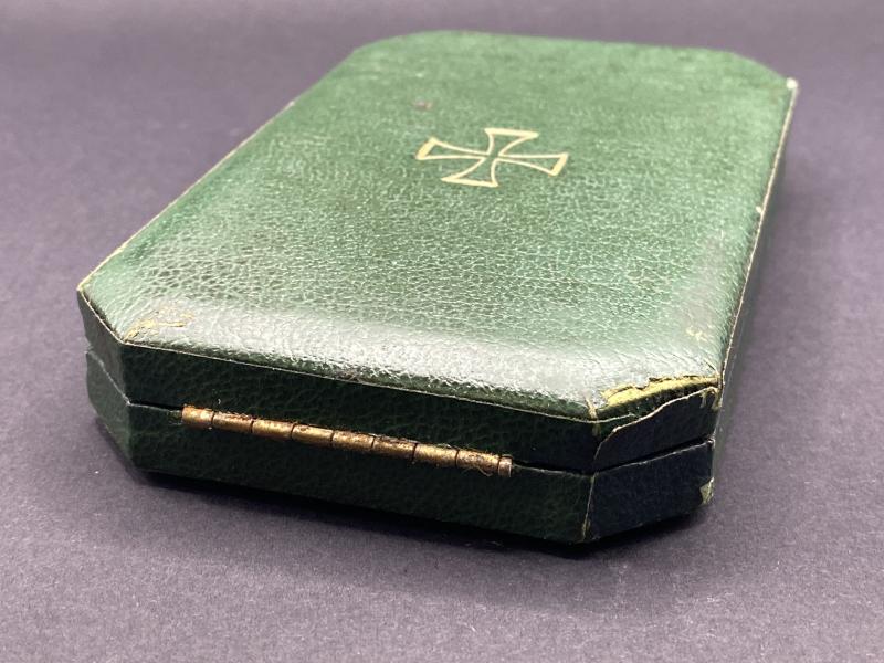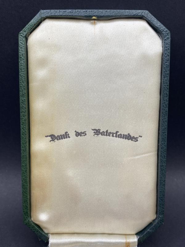 Original WW1 period iron cross case produced privately. A nice green case with imbedded padding for the award with the case cover reading “Dank des Vaterlandes”. In nice clean condition.