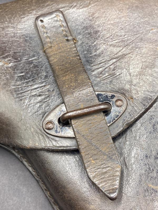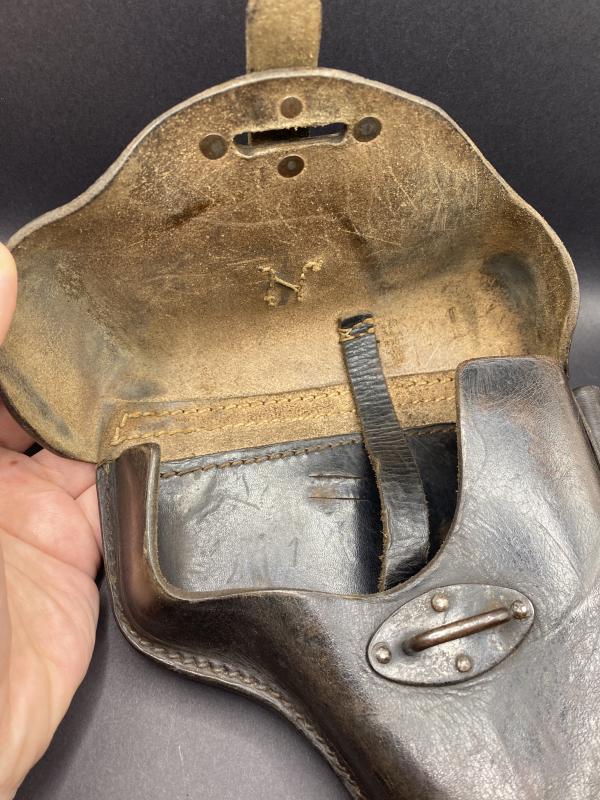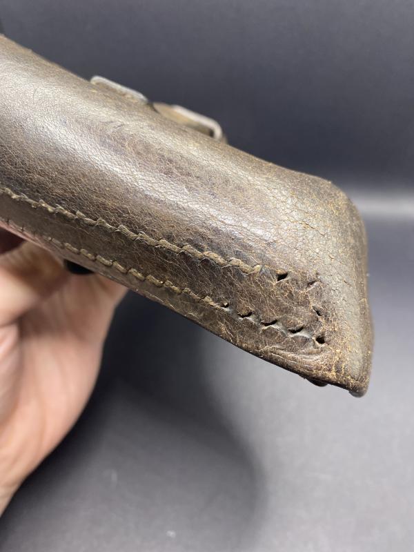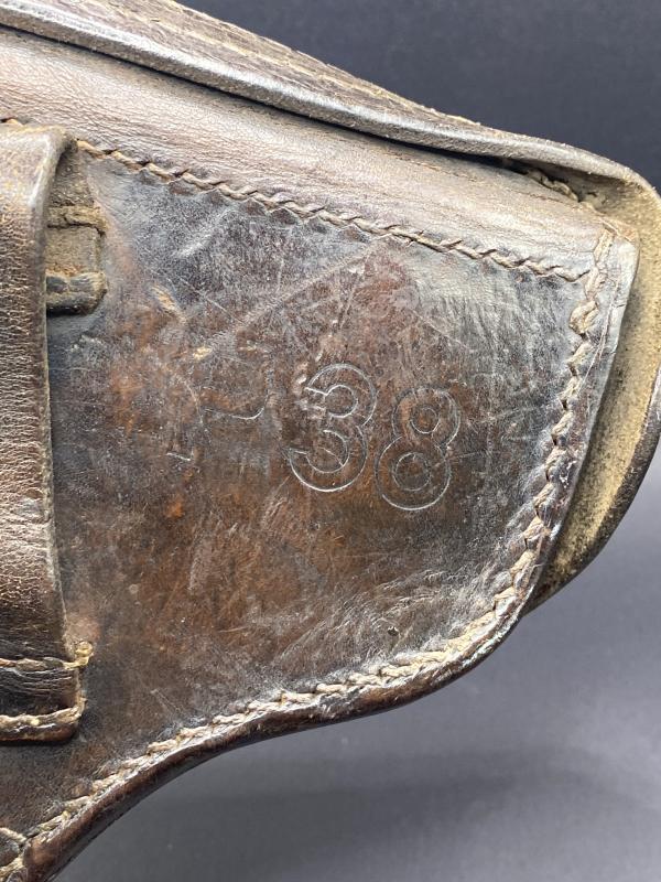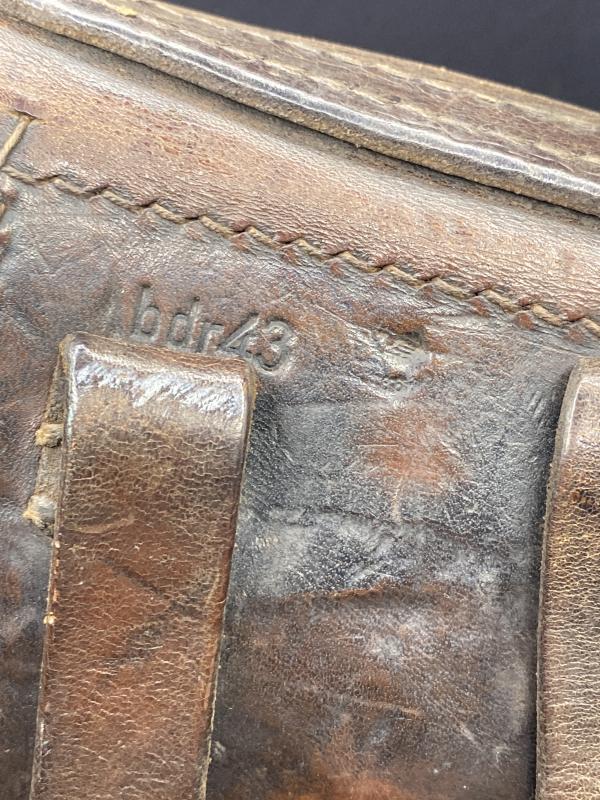 Original brown leather hard shell P38 holster marked bdr43 with Waffenamt inspection mark. In good condition. Leather remains soft, no repairs. A few stitches missing from the opening flap on one corner.
