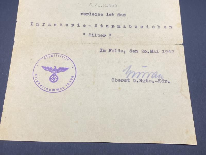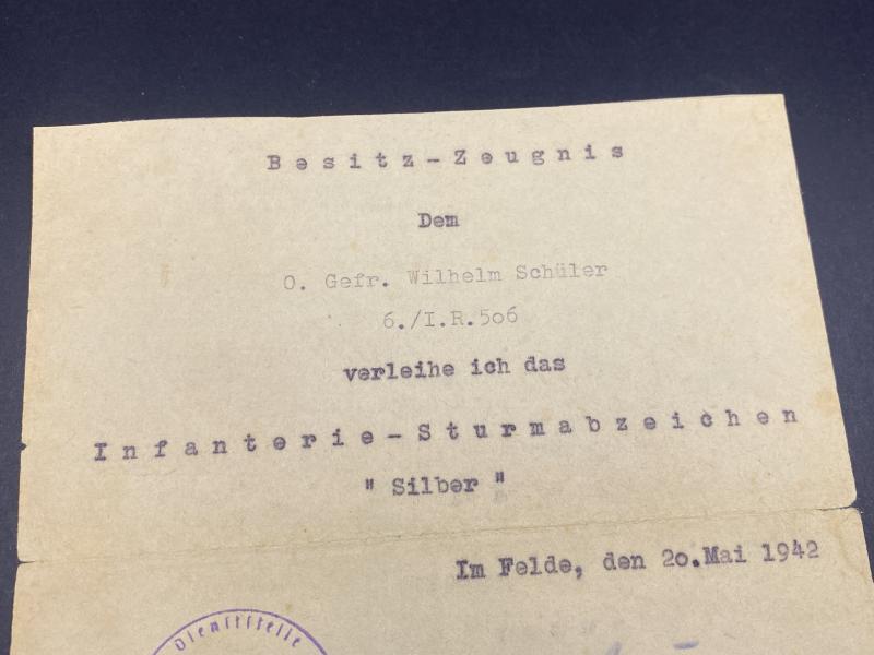 Original field issue citation of the Infantry Assault badge in Silver to Obergefreiter Wilhelm Schüler of Infantry Regiment 506. Single crease present down the middle where the certificate was stored.