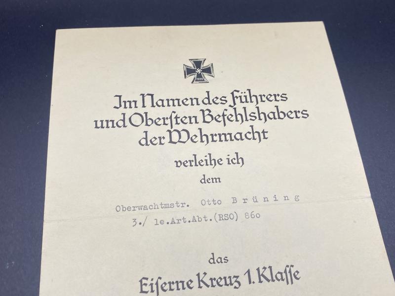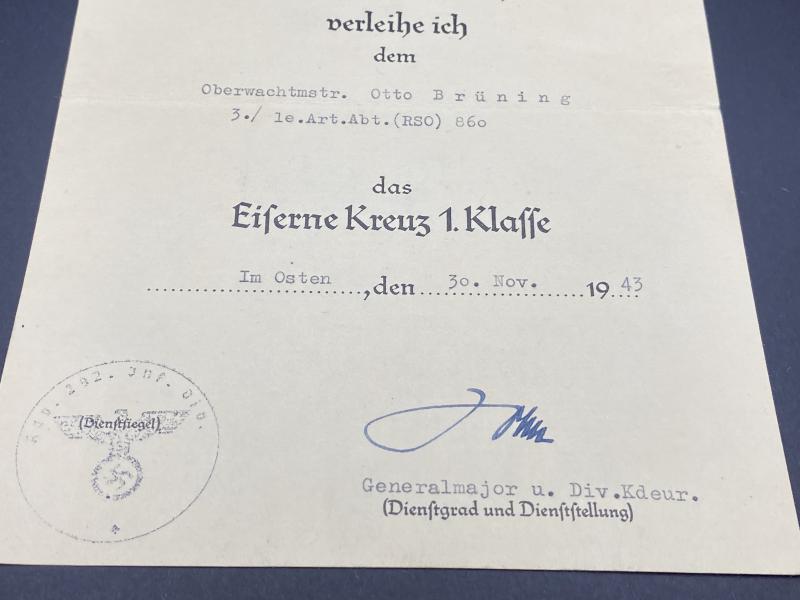Original Citation for the Iron Cross first class issued to Oberwachtmeister Otto Brüning of Le Artillery Abteilung 860. Issued on the eastern front November 1943. Signed by the Major General of 292ID. Nice price with single crease mark down the middle where it was stored.