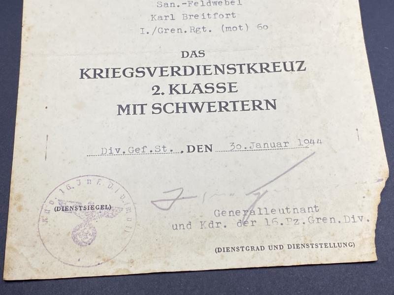 War Merit Cross Second Class Citation San.Feldwebel Karl Breitfort Gren.Rgt.60 (16th Motorized Pz Division “Windhund”)