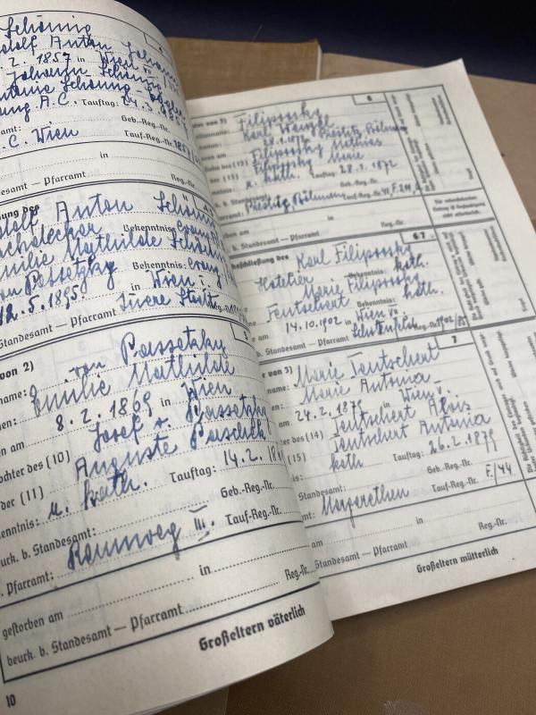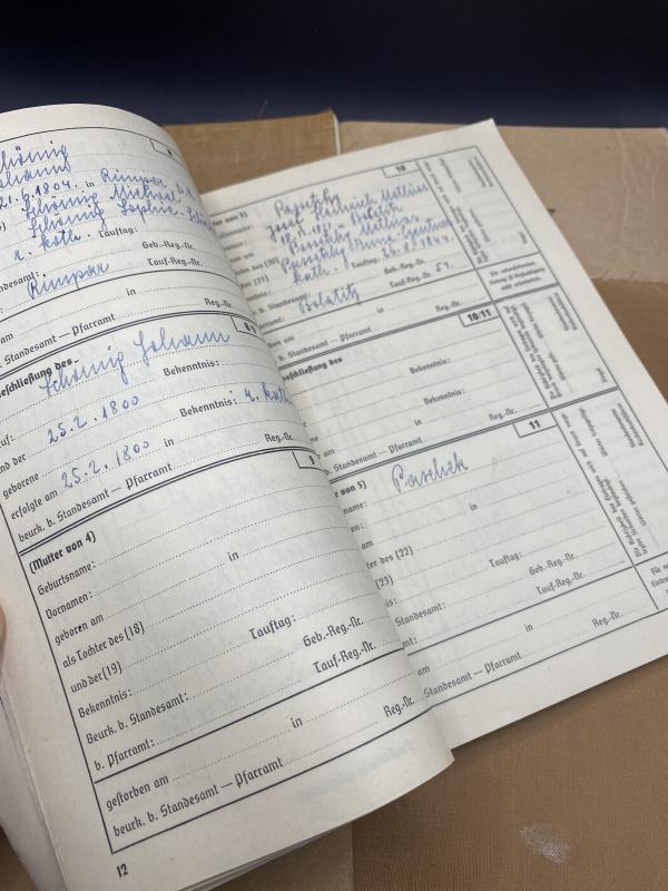 Original third Reich period issued Ahnenpass book issued to all ethnic Germans to prove their racially clean heritage in line with Government definitions of “Pure Germans”. All examples have entries. Some are paperback some have oil cloth covers. We have several of these available so on ordering, one will be selected at random. Photosgraphs representative of just one book. Entries will vary.