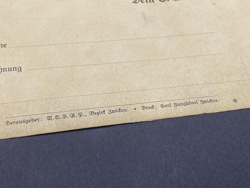 Original pre Third Reich NSDAP paper sign up leaflet as would have been available in beer halls and handed out on the streets during the early days of the party. Some yellowing due to age, as well as some minor creasing.