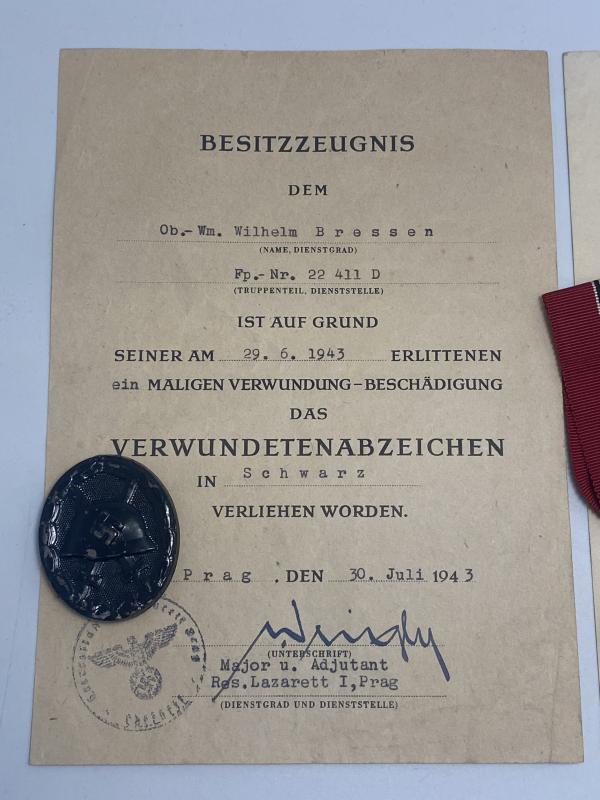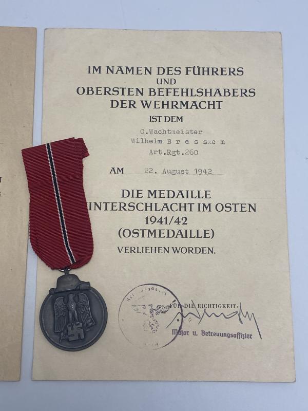 Pair of citations with the awards for an Artillery NCO Wilhelm Bressen. (Eastern front award has his surname as ‘Bressem’, which is incorrect). Both awards in good shape. A neat little group.