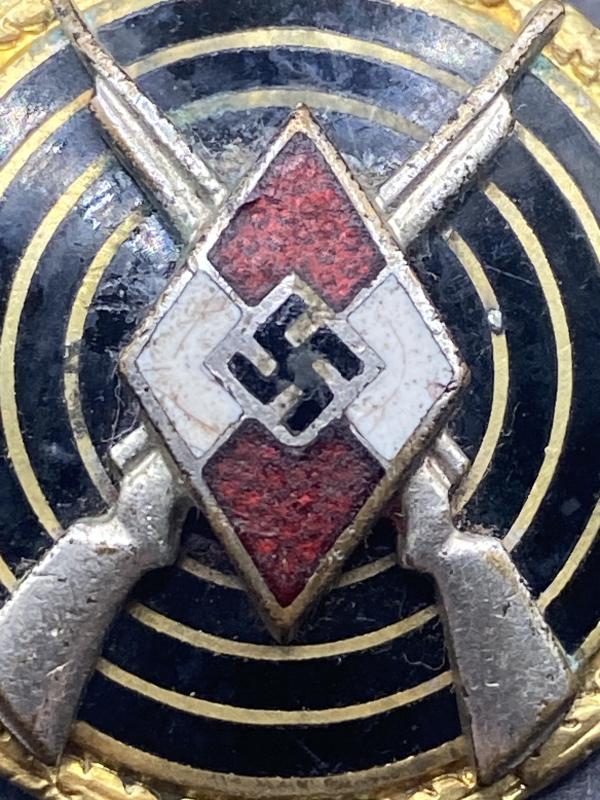 Original Gold grade Hitler Youth marksman badge made by M1/102 Frank & Reif. Enamelling in good condition without cracks or chips. A really nice sought after award.