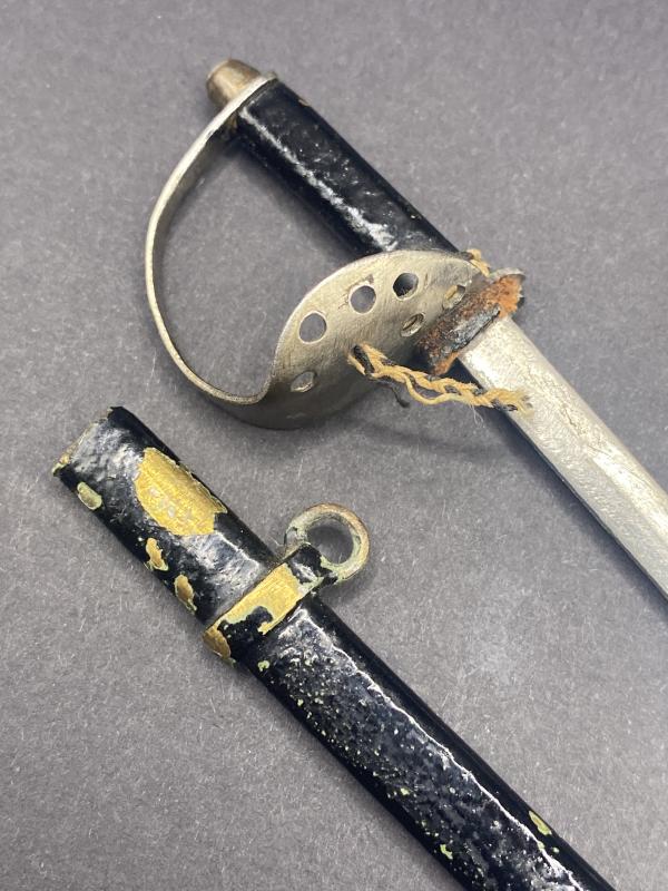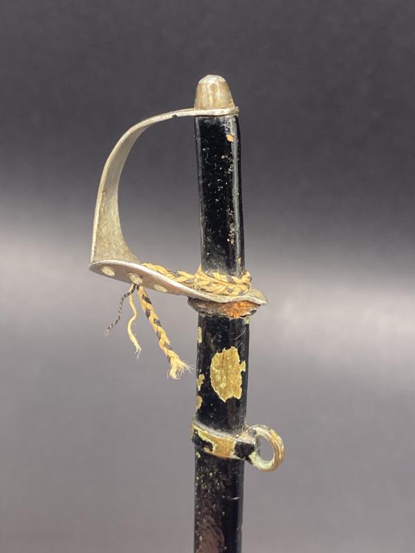 Pretty little miniature letter opener in the appearance of an Imperial German sword. Blade in good condition with painted scabbard. Blade just over four inches long. A nice piece.