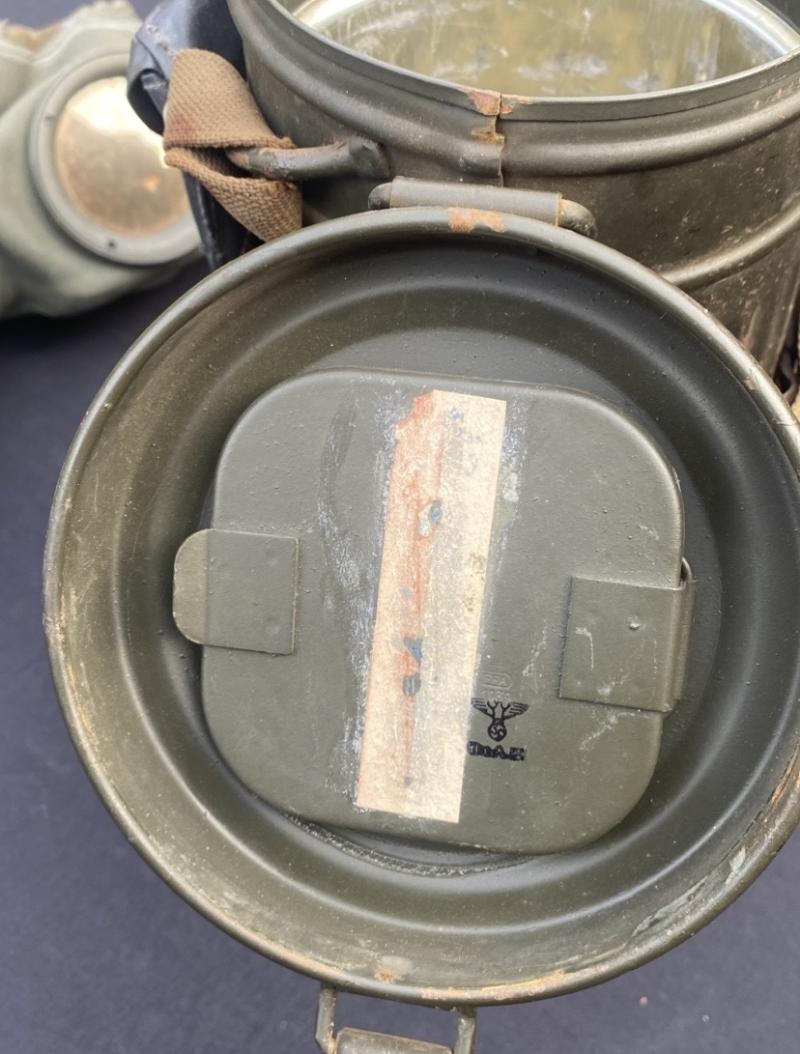 Original complete gas set comprising of the GM30 long gasmask tin, mask, spare lenses, cross strap, gas plane and a pair of RBN numbered utility straps. Mask in good condition complete with all of its accompanying head straps. Tin has some light surface rust. Gas plane pouch is empty but an original wartime production. A very nice set overall.
