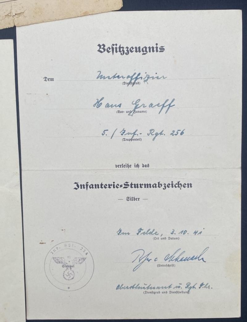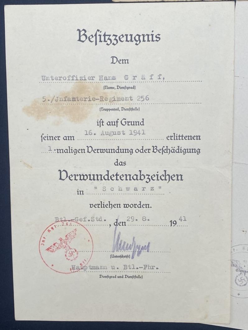 Infantry Assault Badge & Wound Badge Citations to Unteroffizier Hans Graff Inf.Regt.256