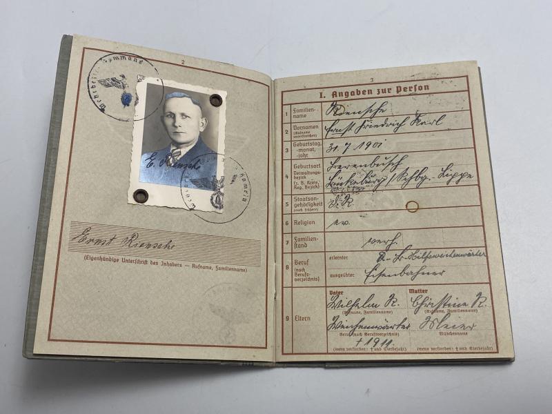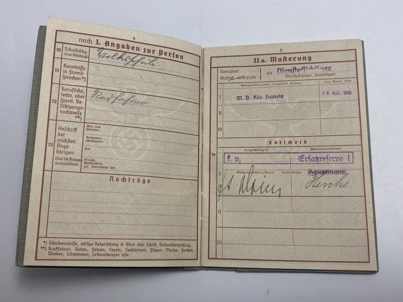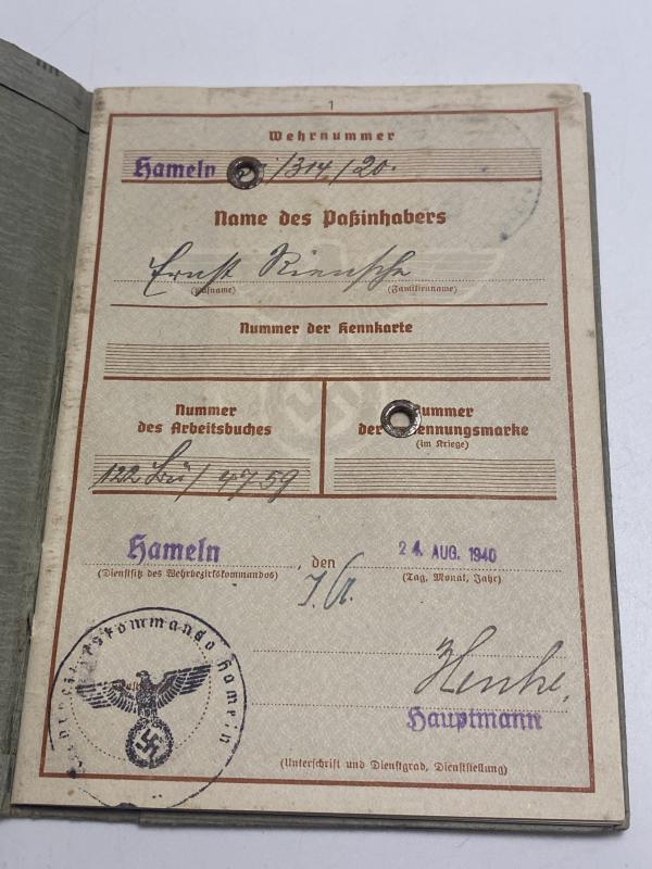 Original German army Wehrpass to Ernst Reische. Reservist driver, joined 24th August 1940. Not many entries inside. No evidence of army service in this book.