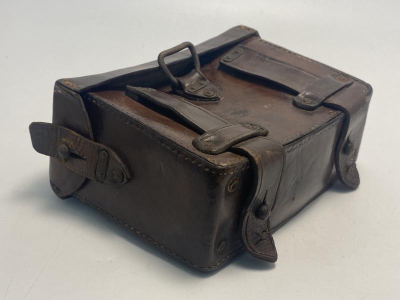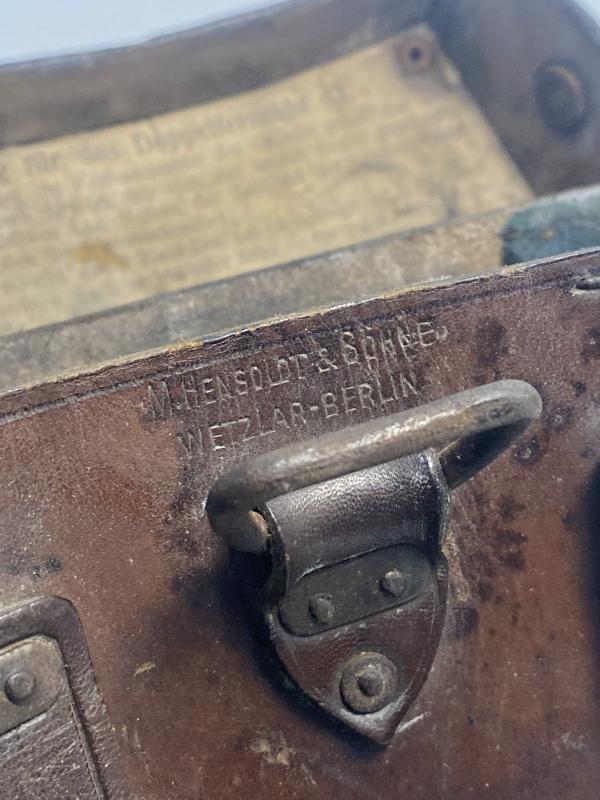 Original German WW1 brown leather case for the Doppelfernrohr 03 field binoculars. Leather in very good condition and soft. Usage sheet present in the top of the lid and makers mark M.Hensoldt & Söhne present.