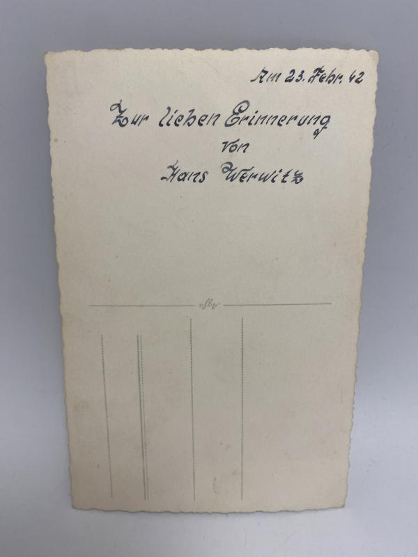 Original postcard size studio portrait of a German soldier in Gebirgsjager uniform. Named on the reverse and dated February 1942.