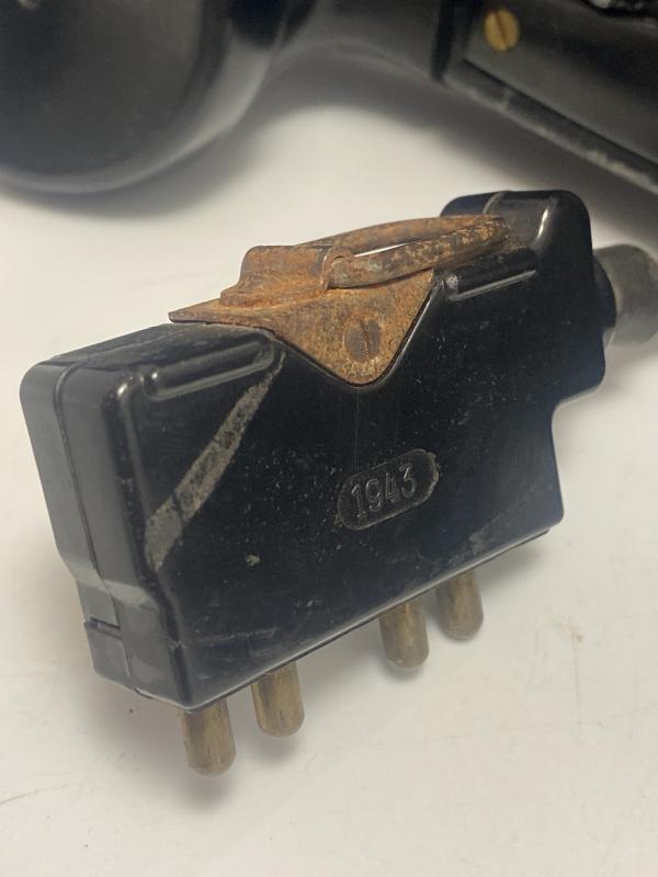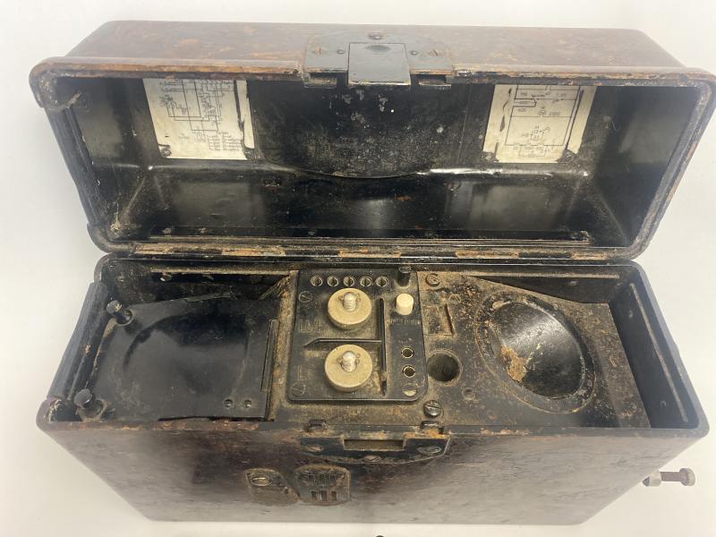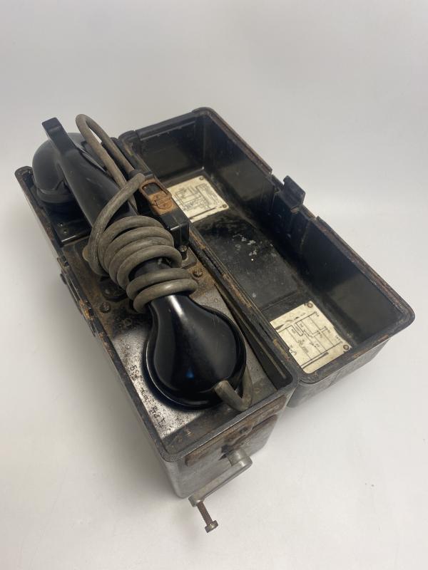 Original German army field telephone complete with battery and handpeice. Field phone WaA marked and dated 1942 with a 1943 dated hand piece. Everything moves and functions like it should. An old French battery is still connected inside. This item has not been tested to see if it is working so is being sold as a non working piece. Whinding handle present on the side of the case.