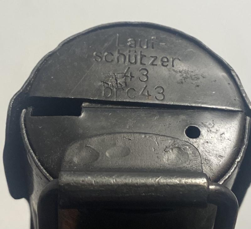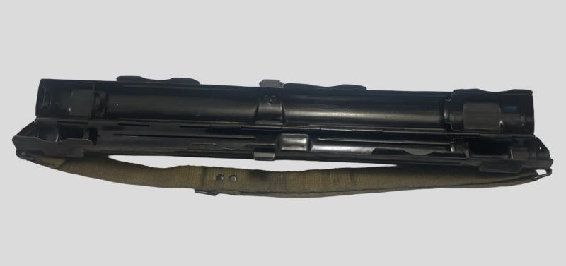 Original German army MG barrel case. Marked Lauf-Schützer brc43 with WaA acceptance stamp. Likely post war painted in grey and a post war sling applied. Becoming increasingly hard to find real wartime barrel cases!