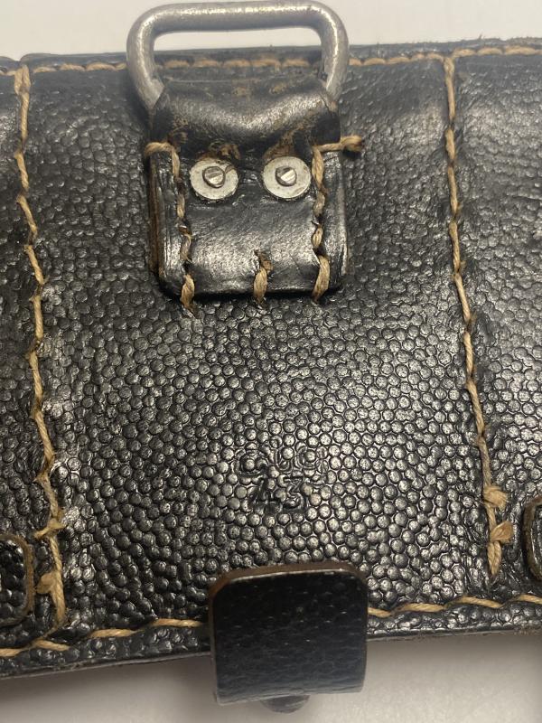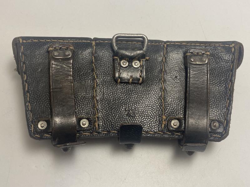 German army K98k ammo pouch. Leather is soft throughout, complete with internal dividers. Faint code on the reverse with the date 43.