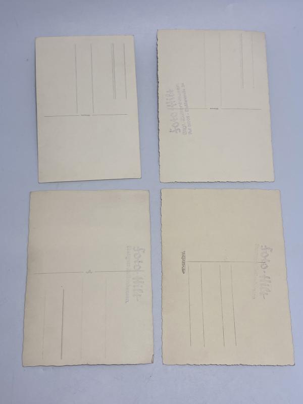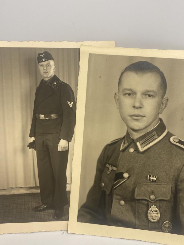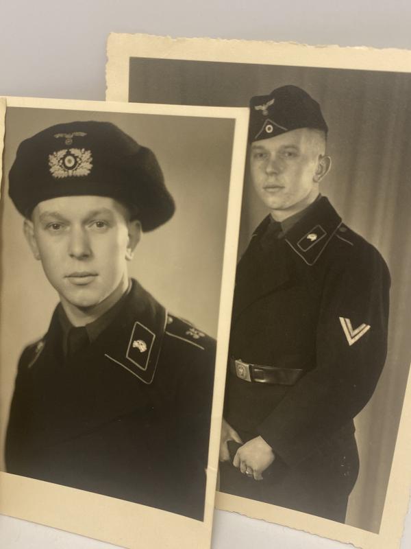 Four postcard size studio portraits to an unknown panzer crewman. One photo features him wearing the early panzer beret with insignia of the 35th Panzer Regiment, the next photo he wears his Feld blouse with silver panzer assault badge, silver grade wound badge and ribbons for the Iron Cross, War merit cross with swords and Sudetenland campaign medal. The final two photos he wears his panzer wrapper and overseas cap. Three of the photographs are marked on the reverse to a Stuttgart based photographer. A lovely grouping. Rare to find so many photos in a large size to a single man.