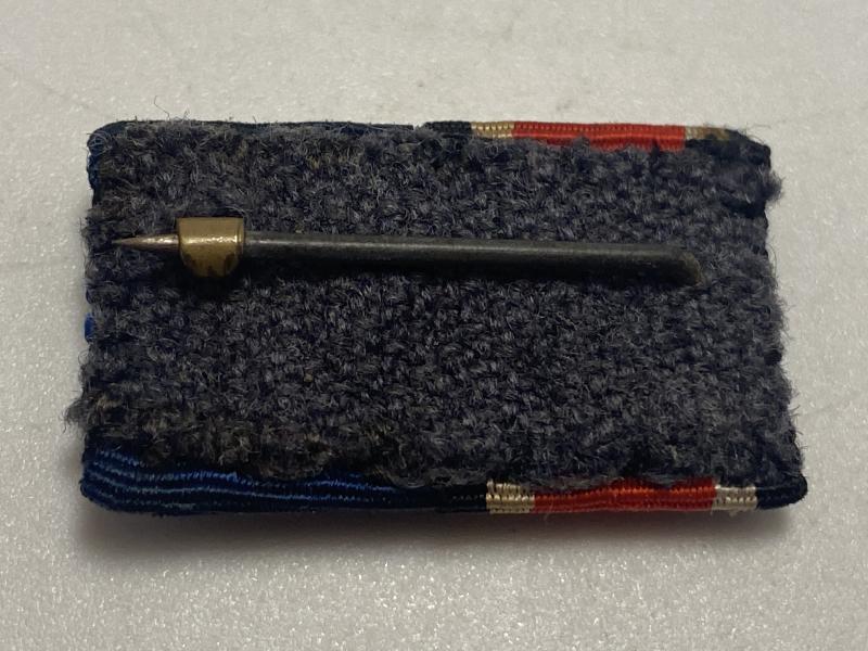 German army ribbon bar with two placements, iron cross second class and four year army service medal. Some staining to the ribbons. Pin present on the reverse.