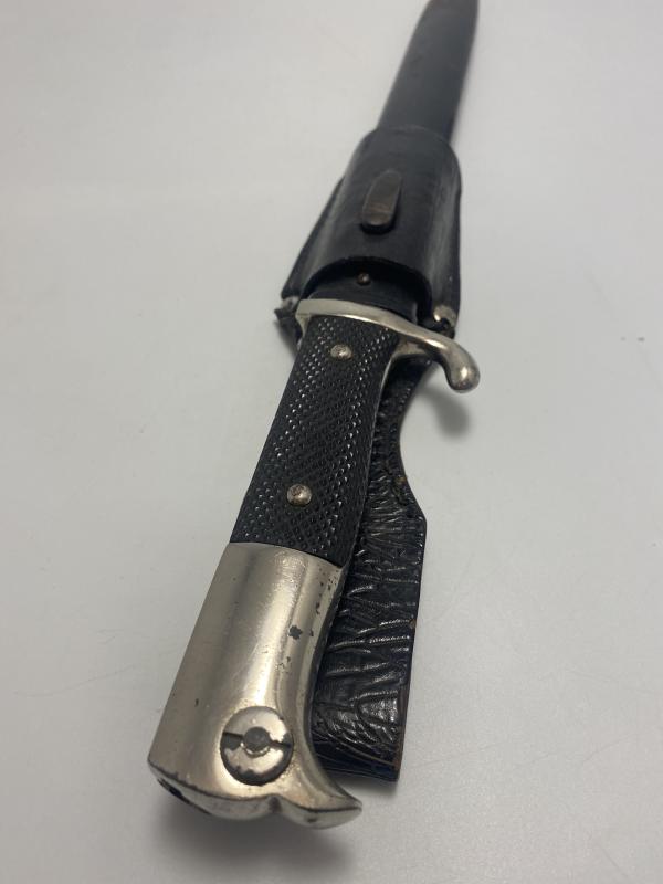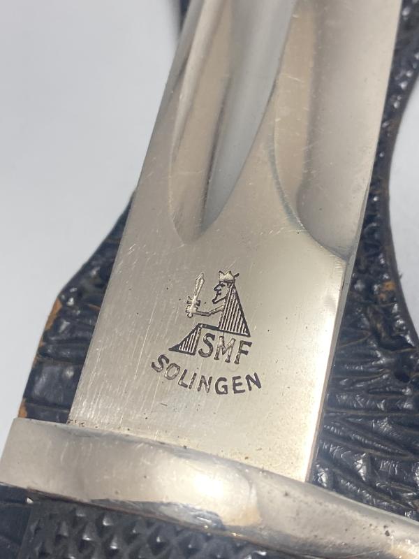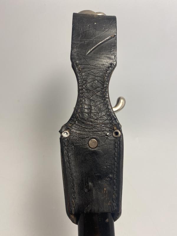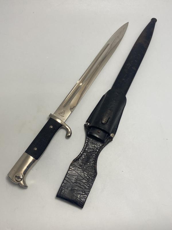 German army parade bayonet made by SMF and complete with leather frog. Bayonet is chromed with Bakerlite grips. Some very minor chips to the chrome on the handle, the blade is in near perfect condition. One repair on the frog where a metal stud had been replaced. Overall a nice example.