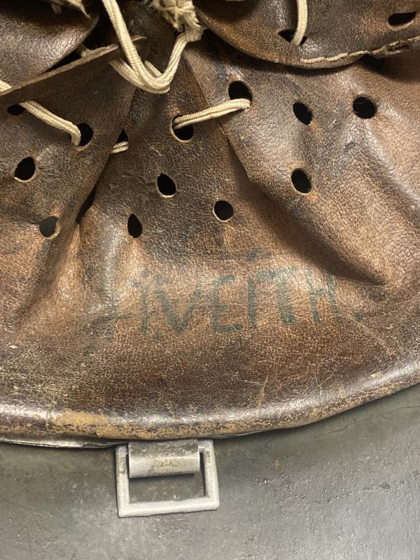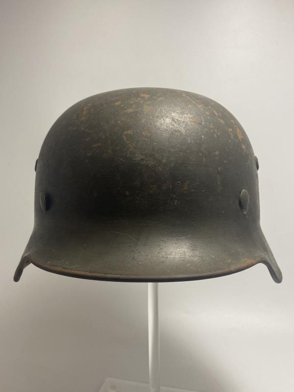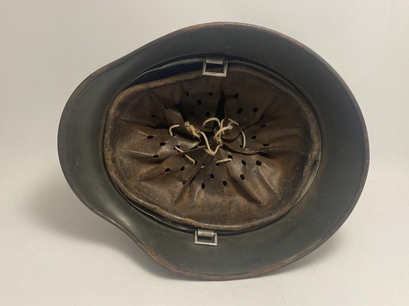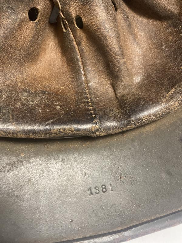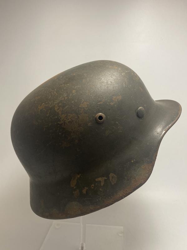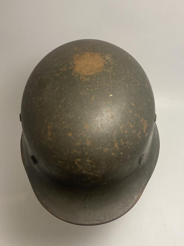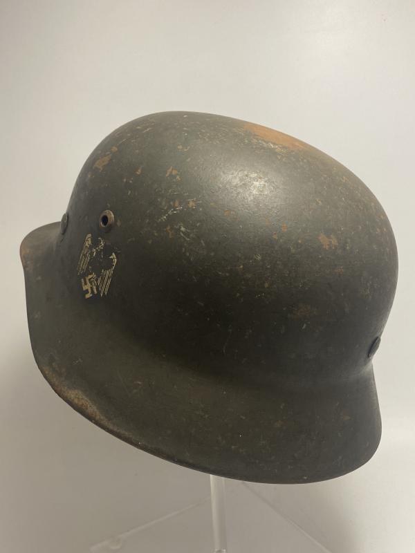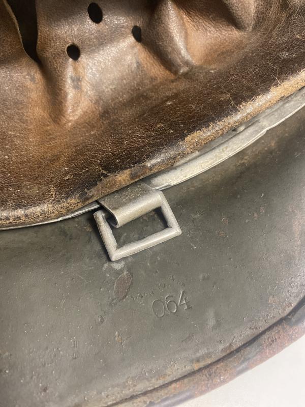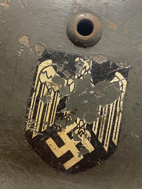 Original German army single decal M40 Helmet made by Quist (64) batch number 1381. Original paint on the shell both inside and out, touch ups evidently made on the split pins, this is often seen as the highest points on the helmet had the paint wear first. A good 75%+ of the decal remains in place including the illusive swastika. Shell is fitted with its original liner which bares the name ‘Fiveith’ in green pen. Aluminium loops for the chinstrap remain present with the helmet. Some light surface rust on the helmet, notably on the crown and on the rim. Overall a really nice helmet that displays fantastically.