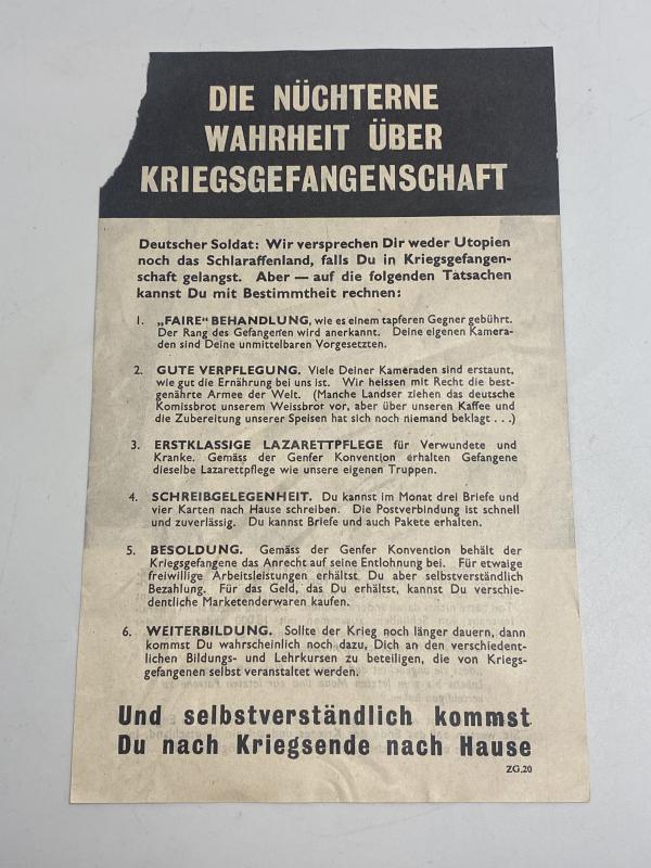 Original British printed leaflet regarding the surrender of Generalleutnant Von Schlieben at Cherbourg. These leaflets were distributed by air over German fighting positions urging soldiers to drop their weapons and surrender to the allied forces. This two sided leaflet first explains the surrender of Von Schlieben and 18,000 other troops. The reverse tells the German soldier his basic rights in captivity and the promise of his return to Germany after the war. One rip in the top corner of the leaflet however apart from that, it remains in good shape.