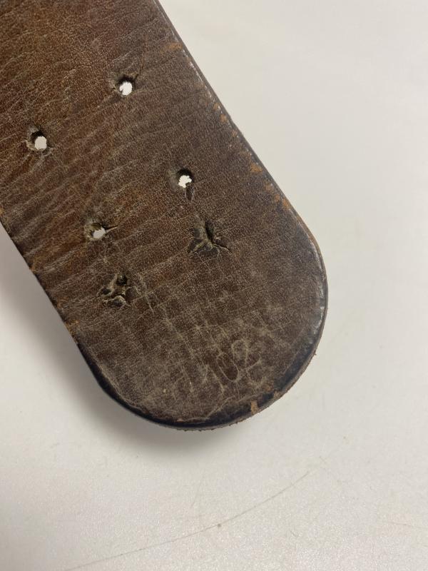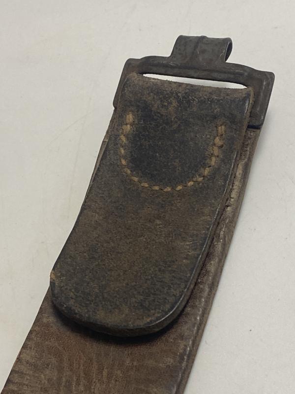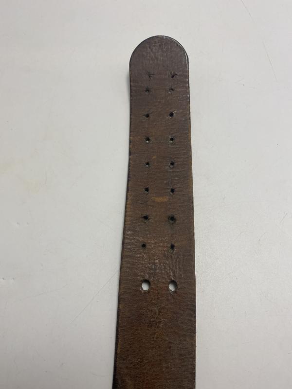 Original late war tongueless German leather equipment belt. In good condition with evidence of use. Sized 102cm. Faint stamp present however unreadable. 1944-45 production.