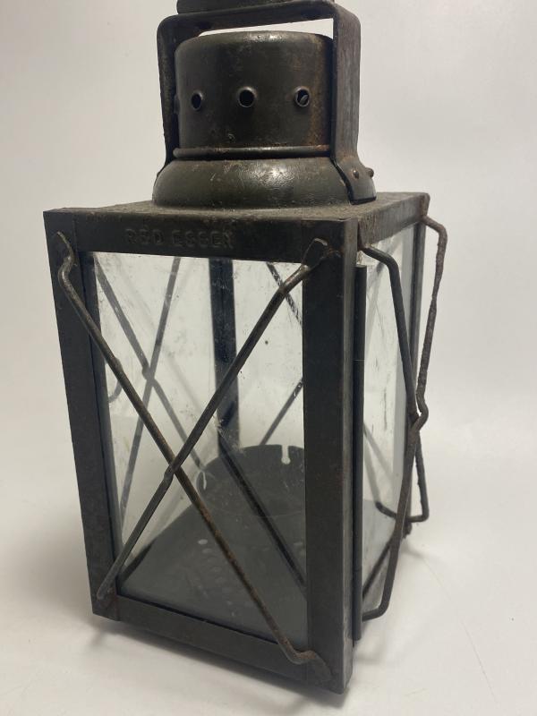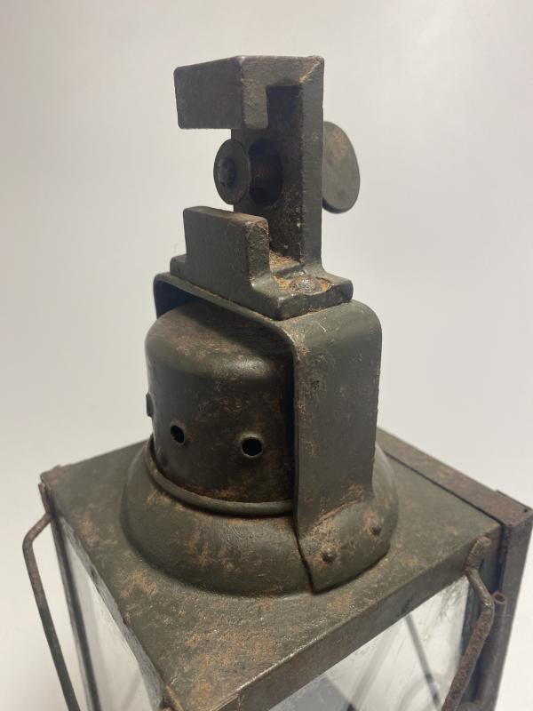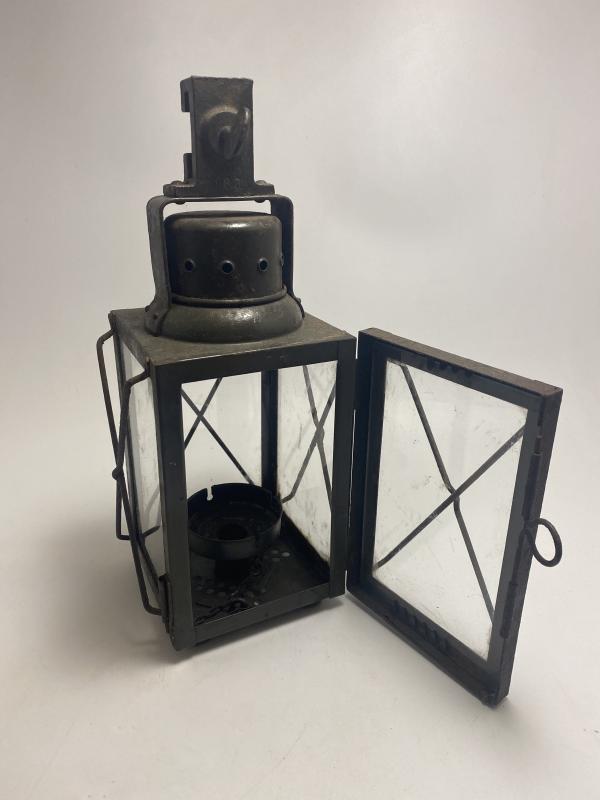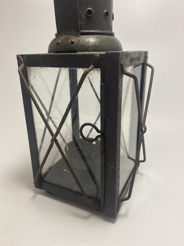 German army candle lamp dated 1940. Lamp is painted in a dark green with four sided glass with wire guard protection. Often described as dugout or bunker lamps. This one is a great example with working door catch, clear glass, original paint and option to hook the lamp at the top. The candle tray remains in place central to the base of the lamp.