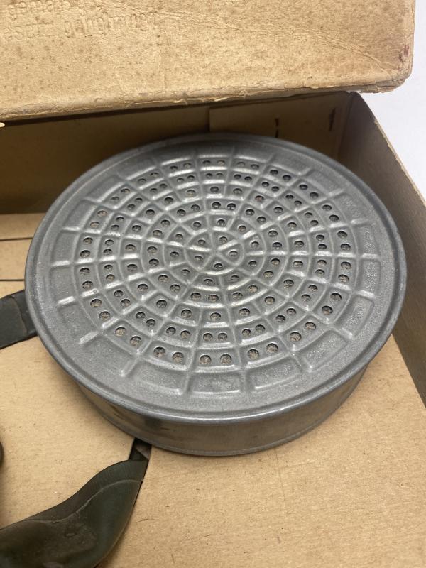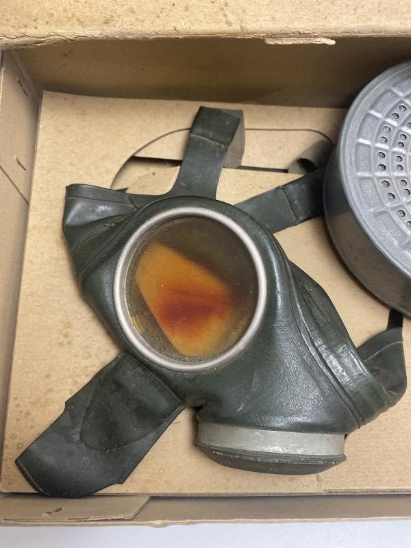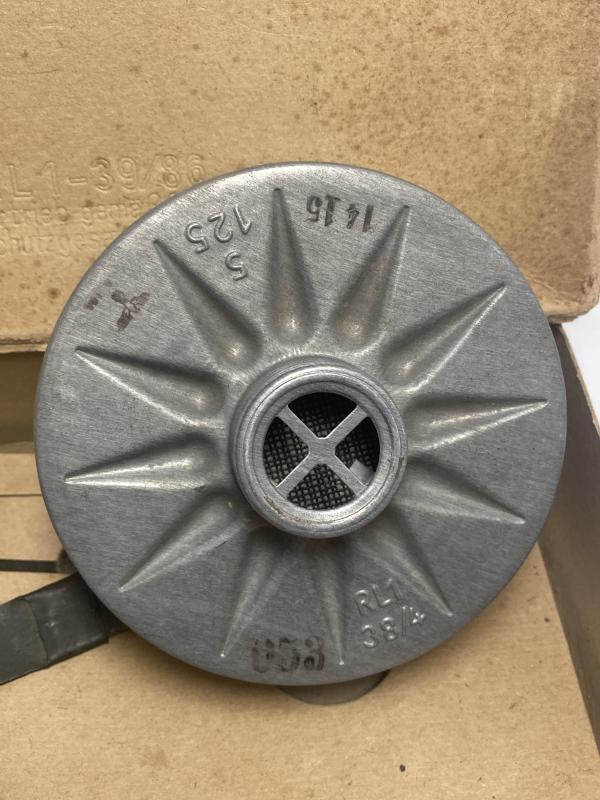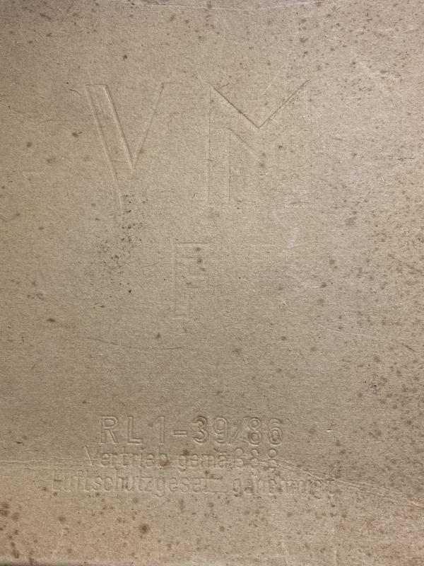 Original German civilian gas mask complete an unissued in box. Complete with filter. Several WaA inspection stamps on the rubber of the mask and on the filter. Some discolouration to the lenses due to storage. Mask comes complete in the original box, some scuffs on the edges as expected.