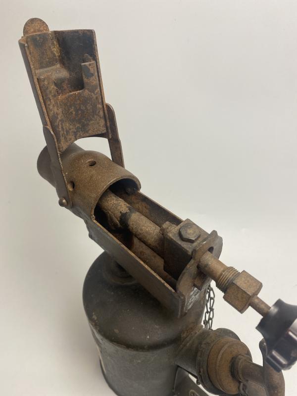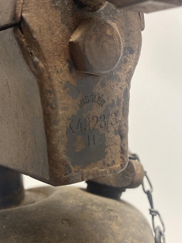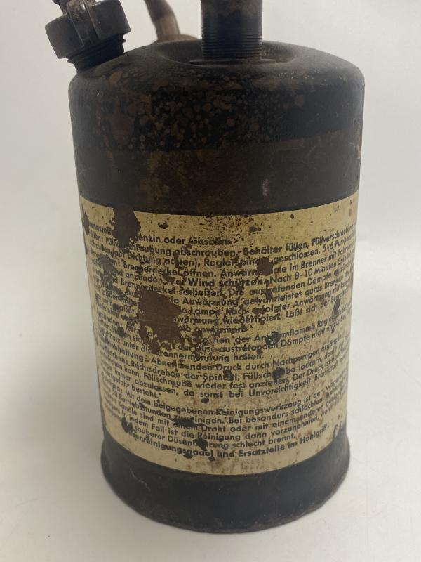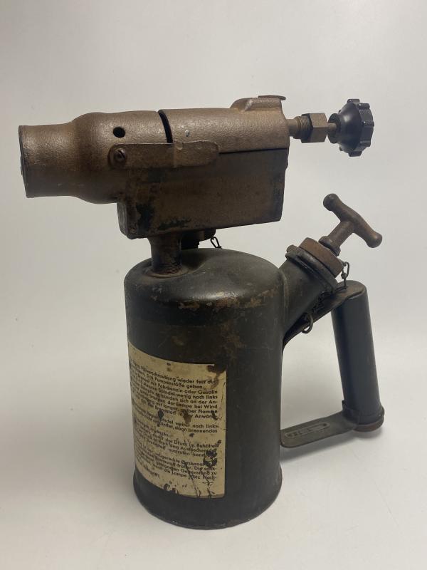 German Army blow torch made by Missler. Used for welding repairs as well as being a vital component in harsh winters to warm engines to start them. Majority of the stencil instructions remain. In good overall condition, torch remains untested.