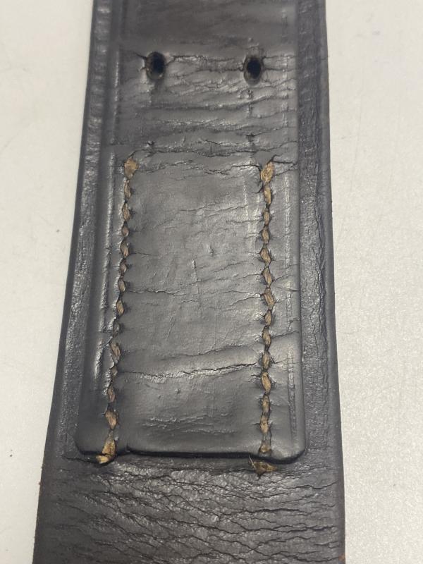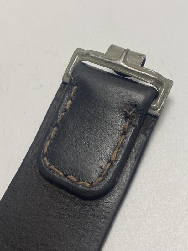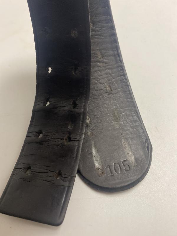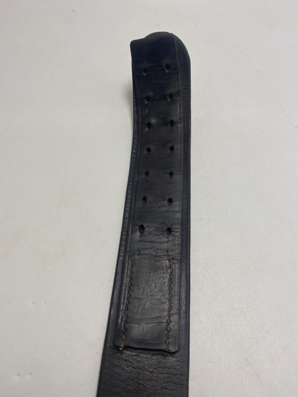Original German army black leather combat belt. Leather has been treated making it incredibly soft. Original tongue fitting in place. Belt marked 105cm but actually measures approx 92cm. Belt has been shortened however from the clip side and resewn. This has been done incredibly well. It is likely this has been period done. Original green painted clip in place.