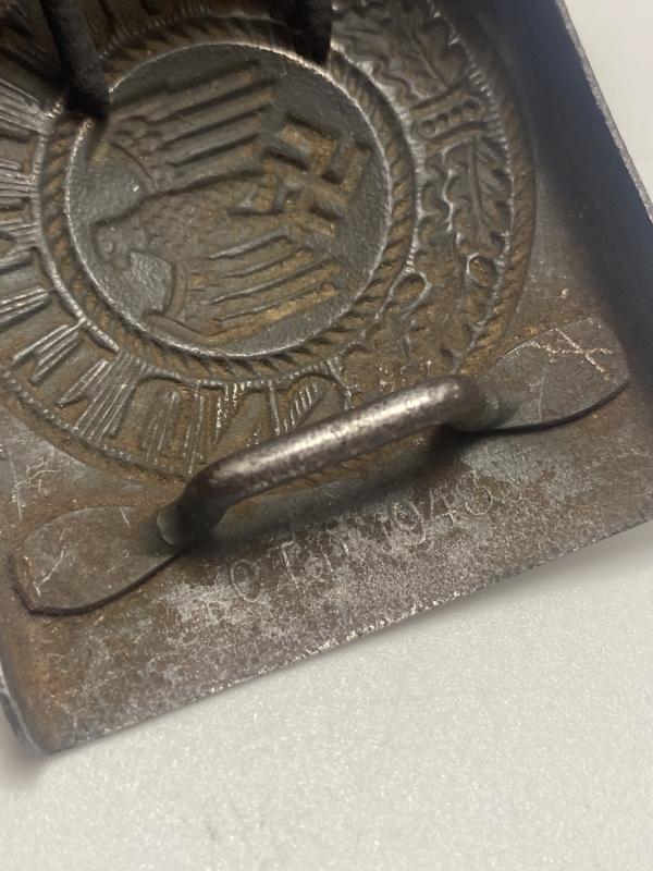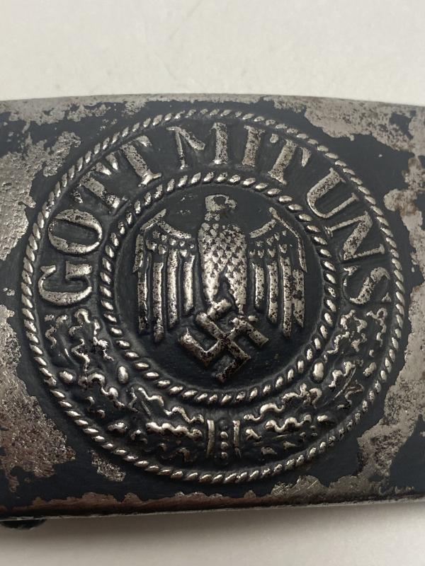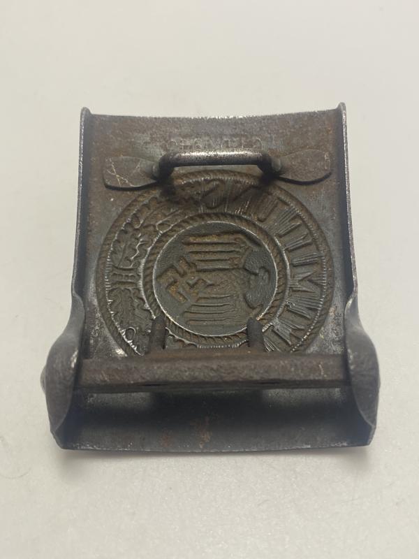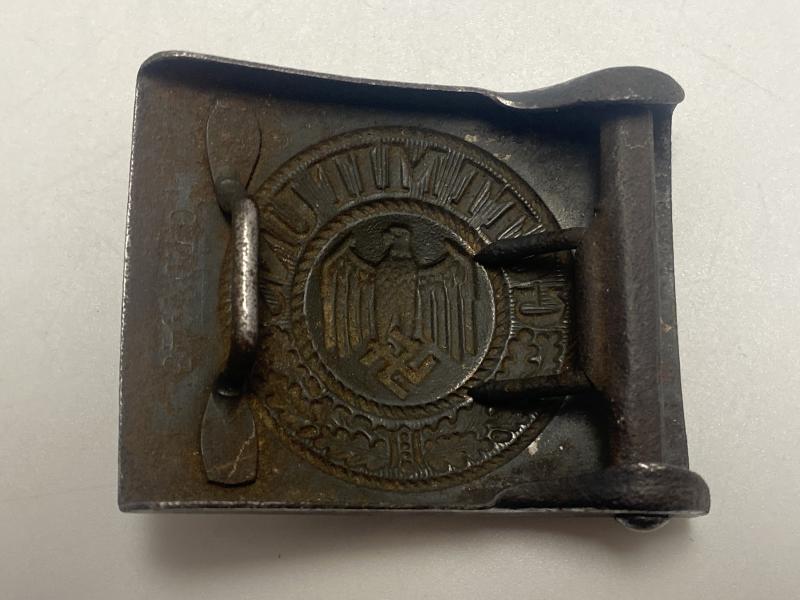 Original German army belt buckle manufactured by CTD 1943. Green combat paint present on the reverse. Front has been repainted a dark grey. Nice late war steel buckle.