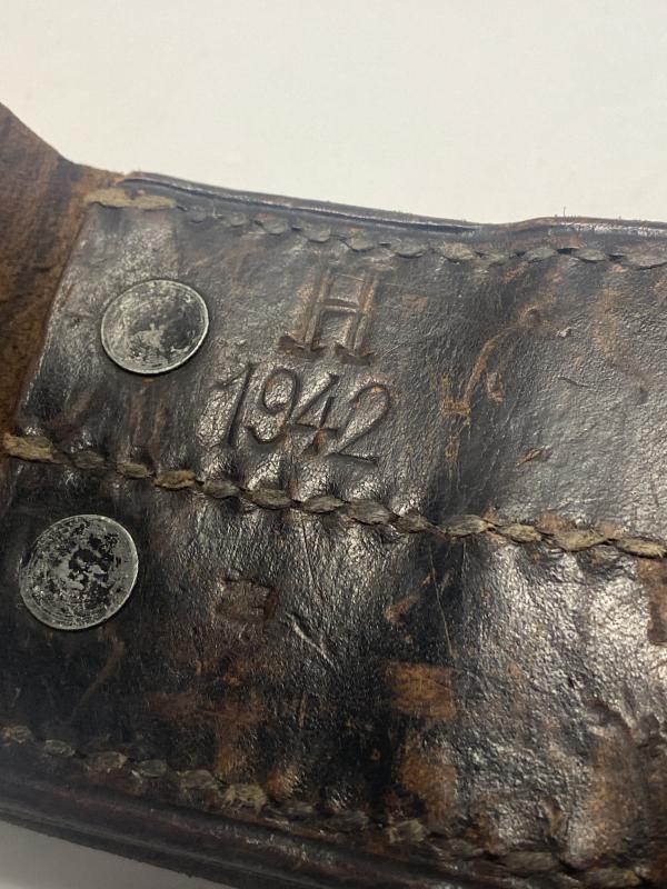 Original German fireman’s belt dating to WW2. Leather is soft and in good condition, complete with two carrying hooks and a leather tab with an unknown purpose. Belt clearly dated 1942 with a police inspection mark.