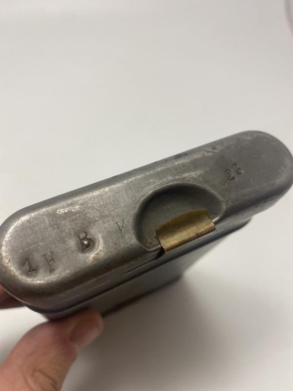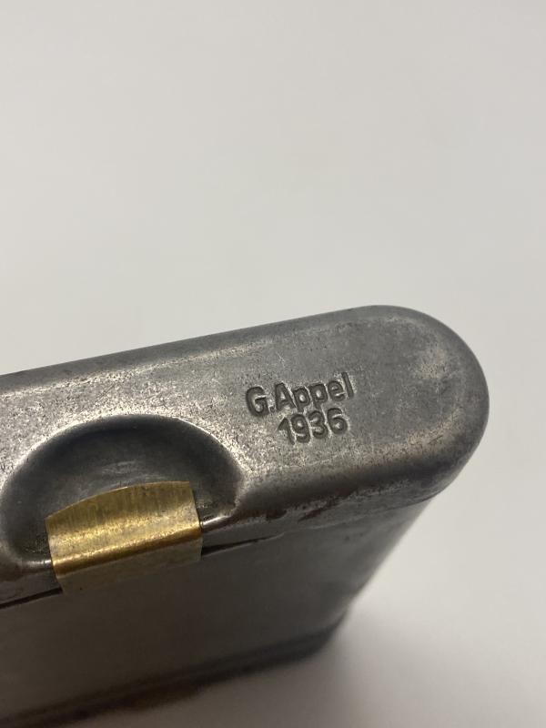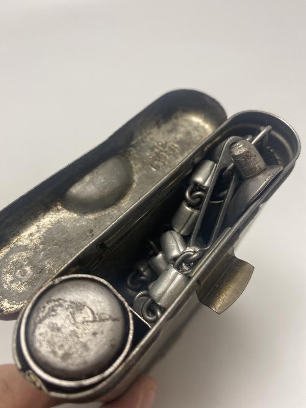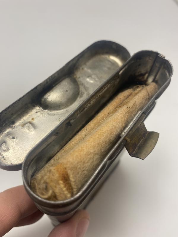 Original German K98k Rigle cleaning kit including oiler bottle, spoon, chain, two brushes and cleaning cloth. All pieces in field used condition. Some pieces marked, others not.