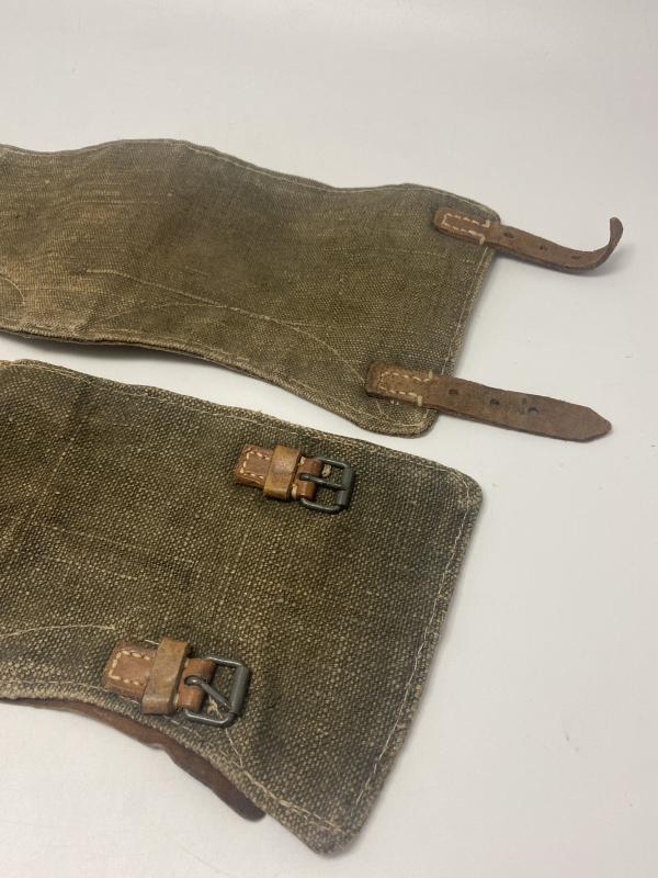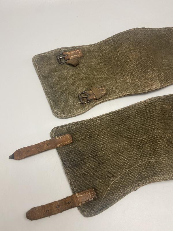 Original Mid-late war universal German gaiters for M37 low boots. One piece of leather damaged. Please check photo. Nicely worn examples, no stamps visible on the canvas.
