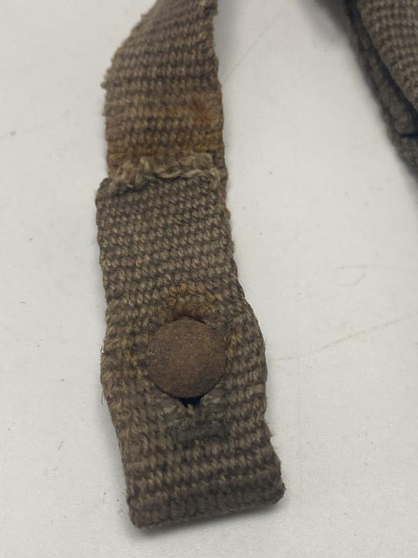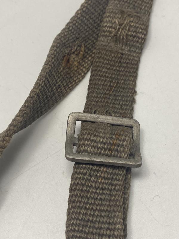Original German army gas mask tin strap. In worn condition. No major splits or damage. In perfectly useable condition.