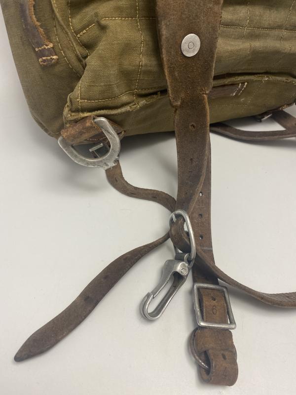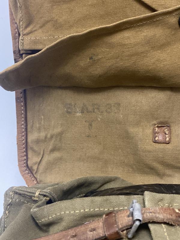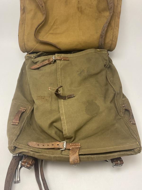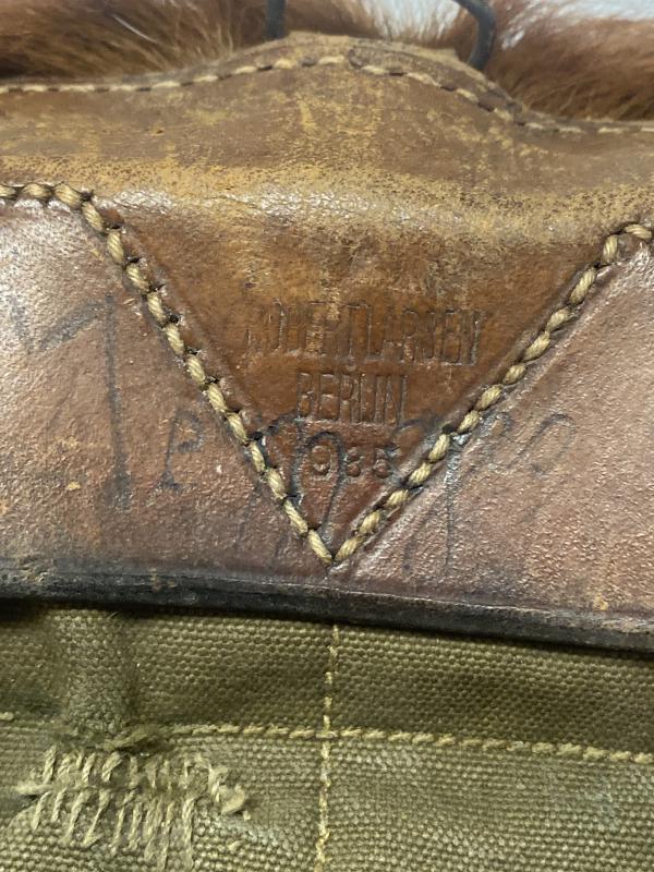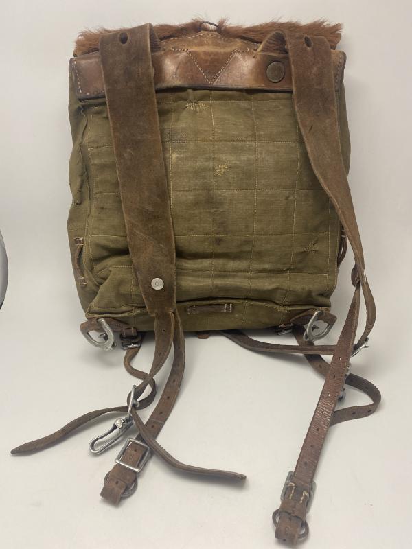 Nice original German army pony fur tornister pack. Berlin maker present in the leather and dated 1935. Some small stitch repairs to the canvas but all the leatherwork in good shape. Inside a unit stamp can be seen (Artillery Regiment 33). One bit of leather has come away inside the bag on a flap that shuts it. Overall a good early pack.