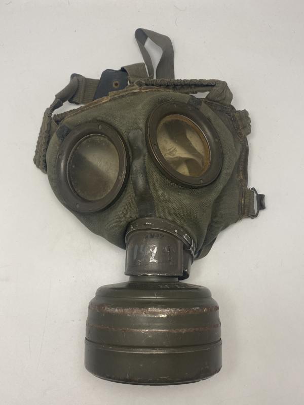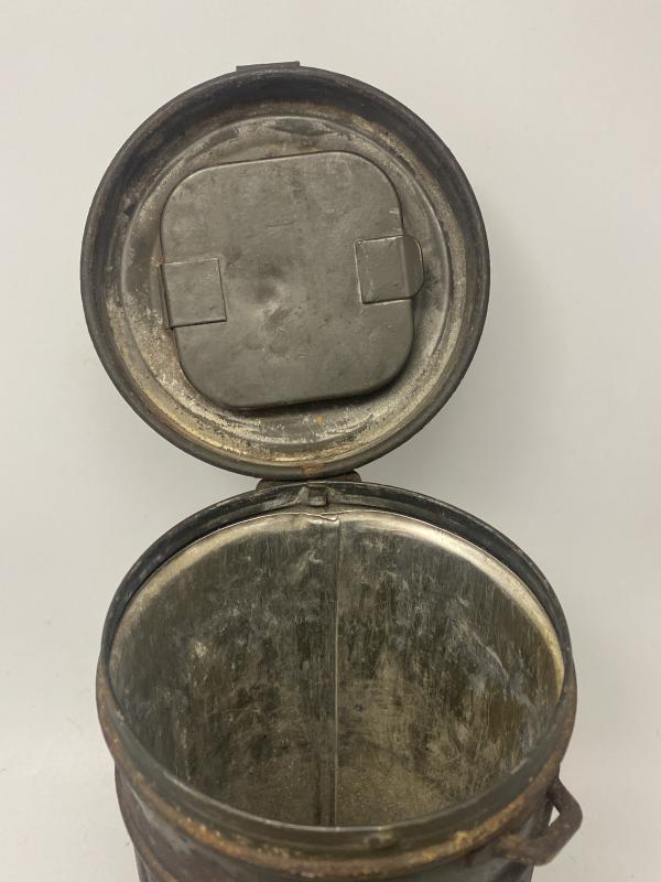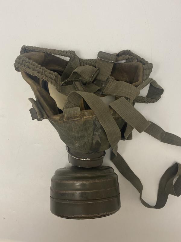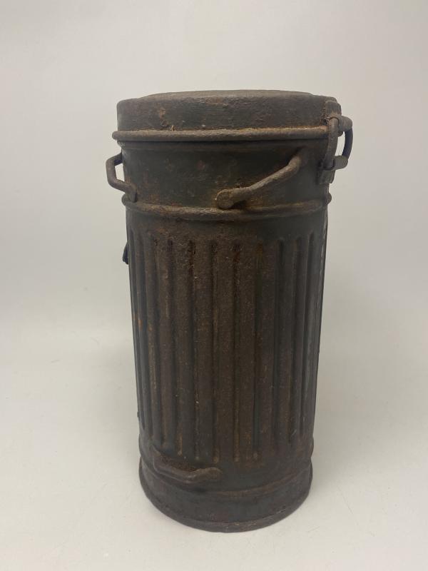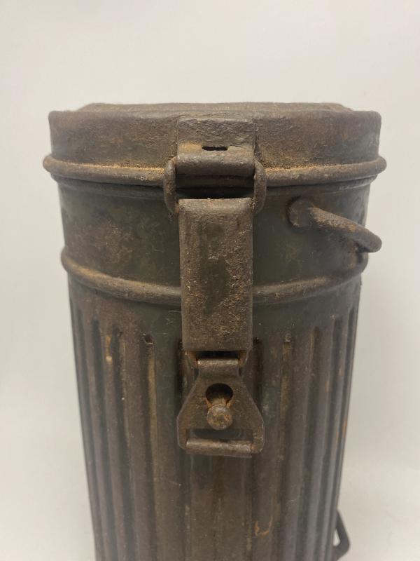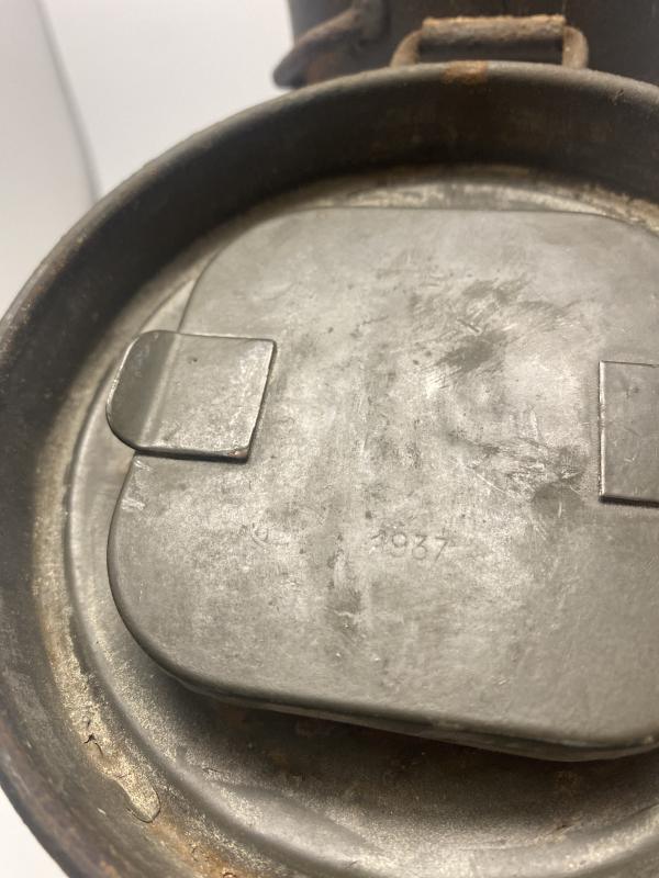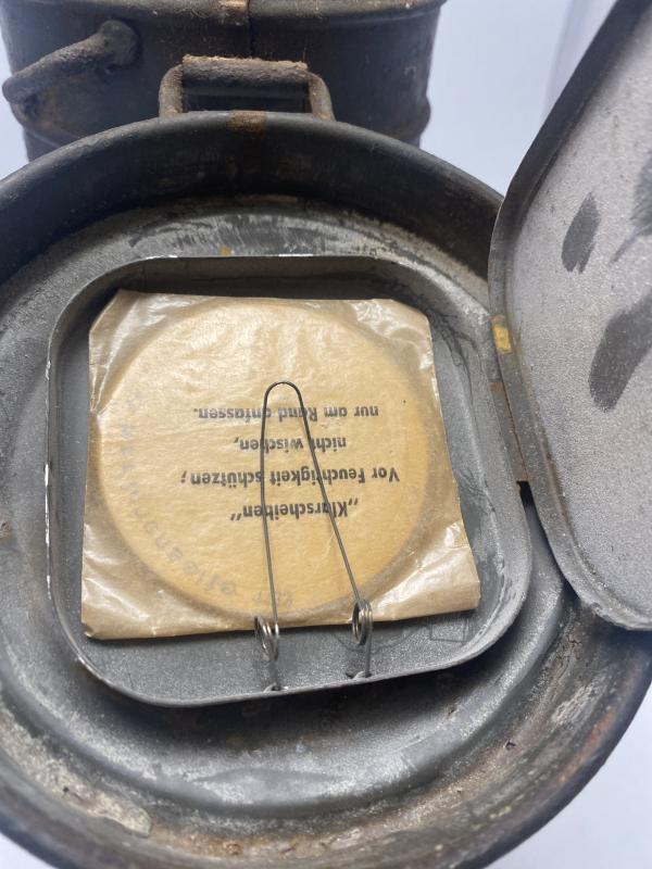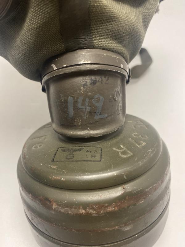 Original German Wehrmacht gas mask and tin, tin dated 1937 with spare lenses present, paint remains on the outside of the can however I would say only 50%. Gas mask in good condition with all straps present. FE37 filter fitted, 42 dated mask. A nice set, earlier short canister harder to find than standard GM30 models.