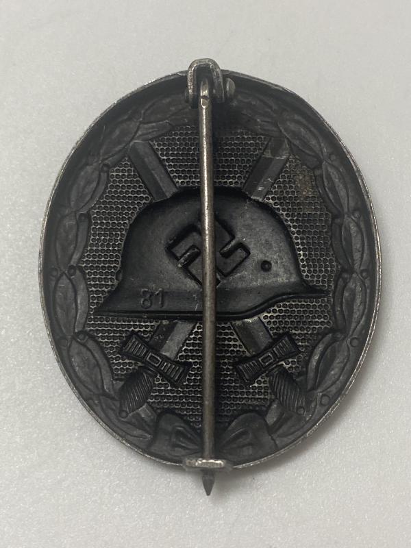 Original wound badge in black, maker msrked 81 for Overhoff. In used condition. Complete with correct pin, hinge and hook on the reverse.
