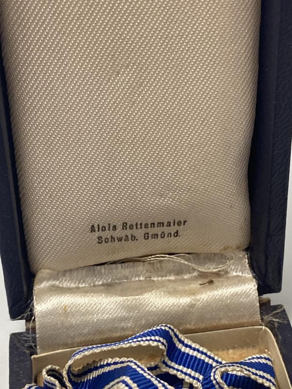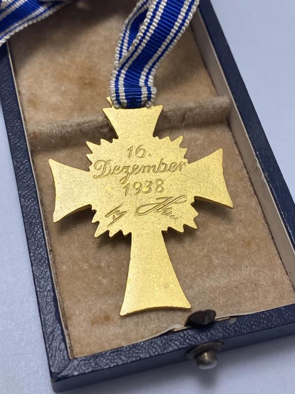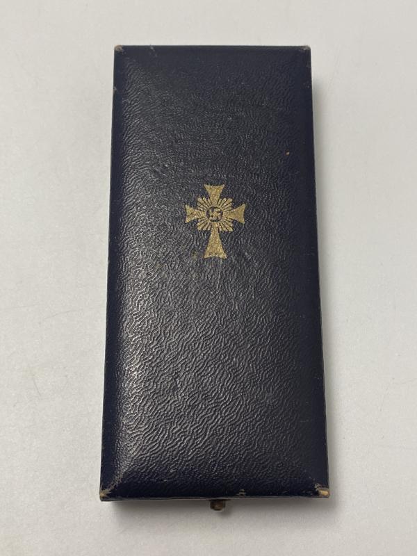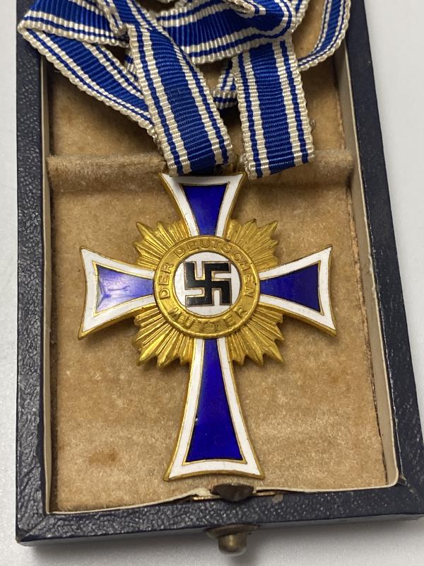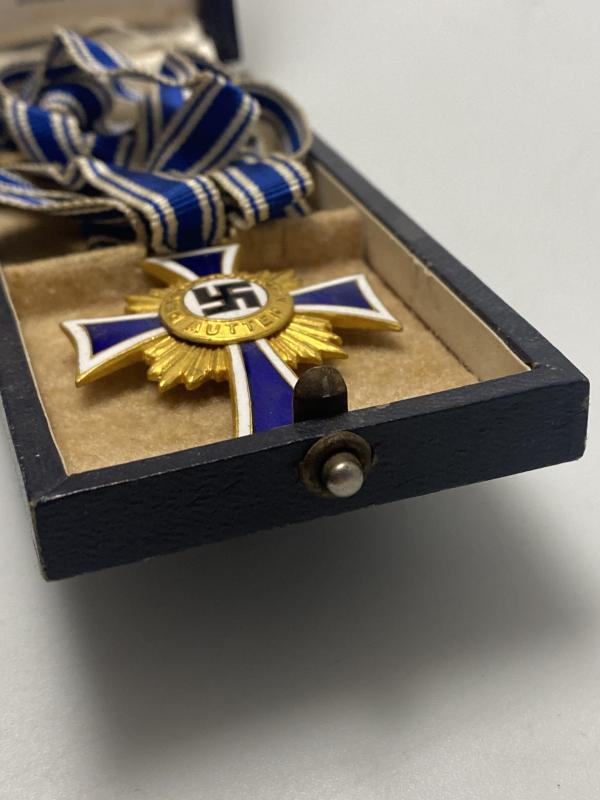 Original Mothers cross in gold complete with ribbon and issue box produced by Alois Rettenmaier. Enamel on the award is perfect, minor wear to the box.