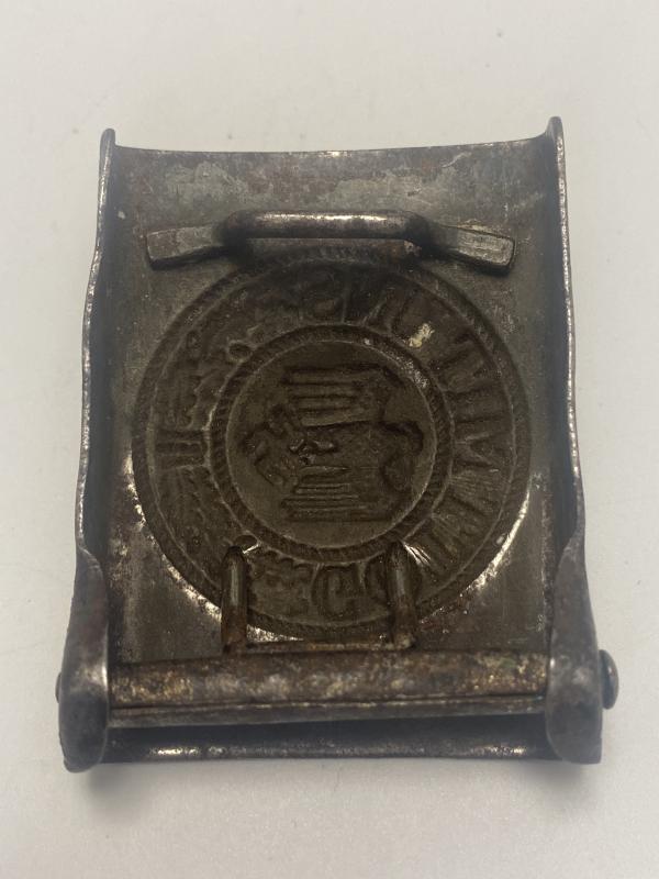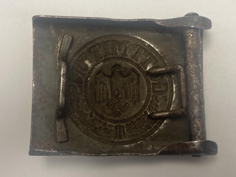 Original German Steel Heer belt buckle without maker mark. Grey painted on the front, remains of green factory paint on the reverse. A fair example.