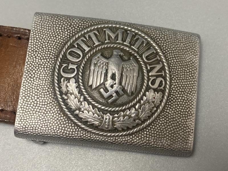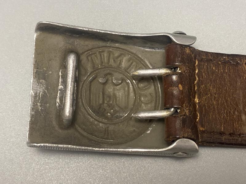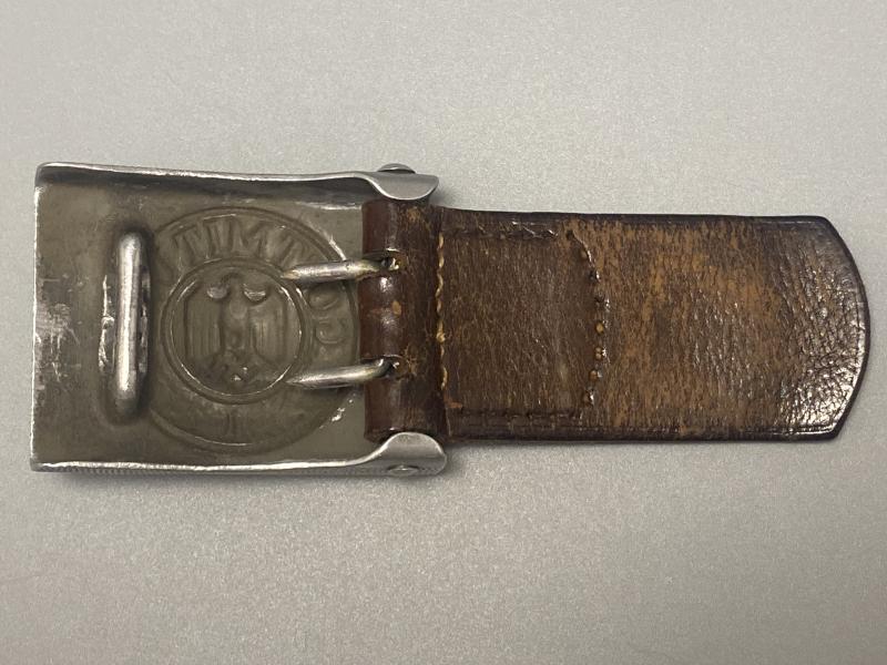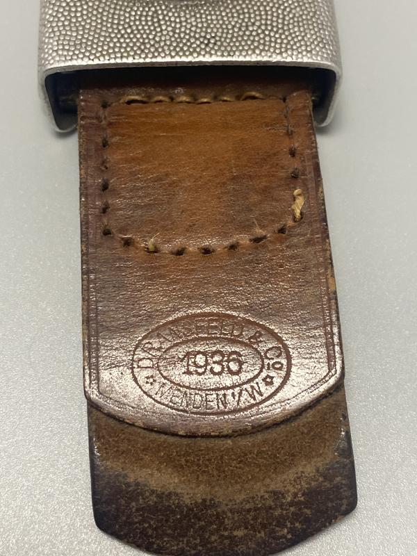 Original early Dransfeld made aluminium army belt buckle complete with brown leather tab. Dated 1936. In good used condition.