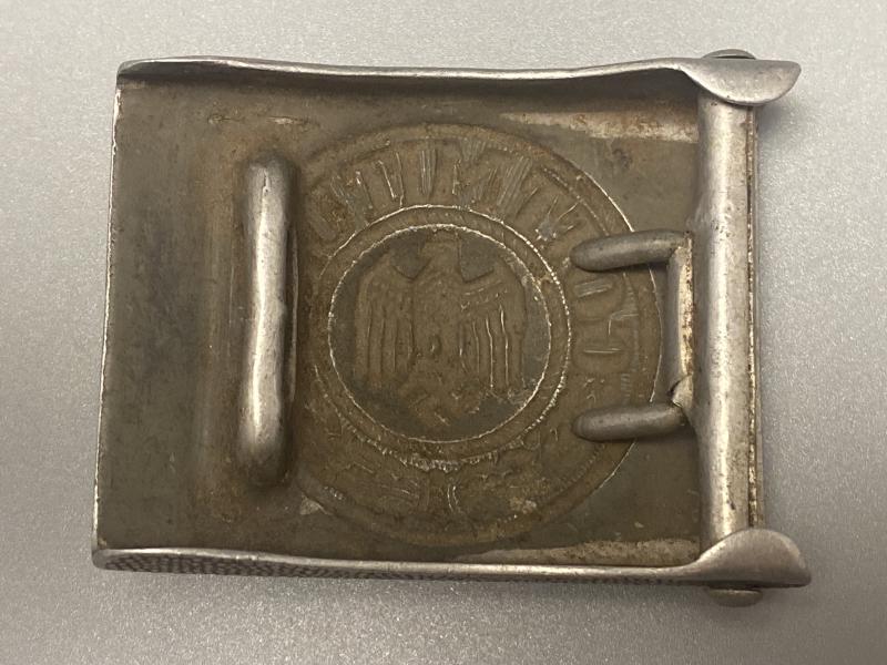 Original German Army belt buckle. Aluminium variant, early production. No makers mark present. Reverse shows clear indication of factory applied green combat paint. A nice field worn buckle.