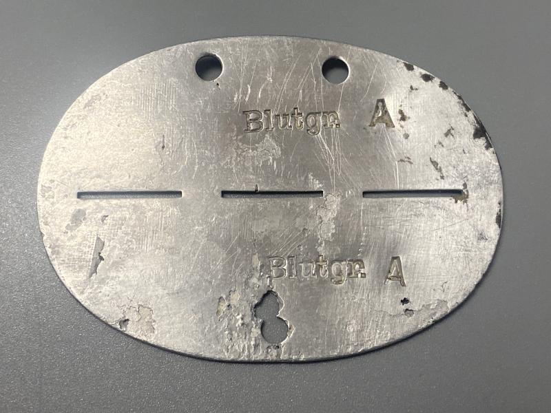 Original German airforce aluminum ID tag Luftnachtrichten Funker (Radio Operator) Ersatz Kompanie 19/13. Blood group A.