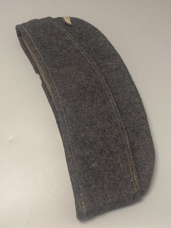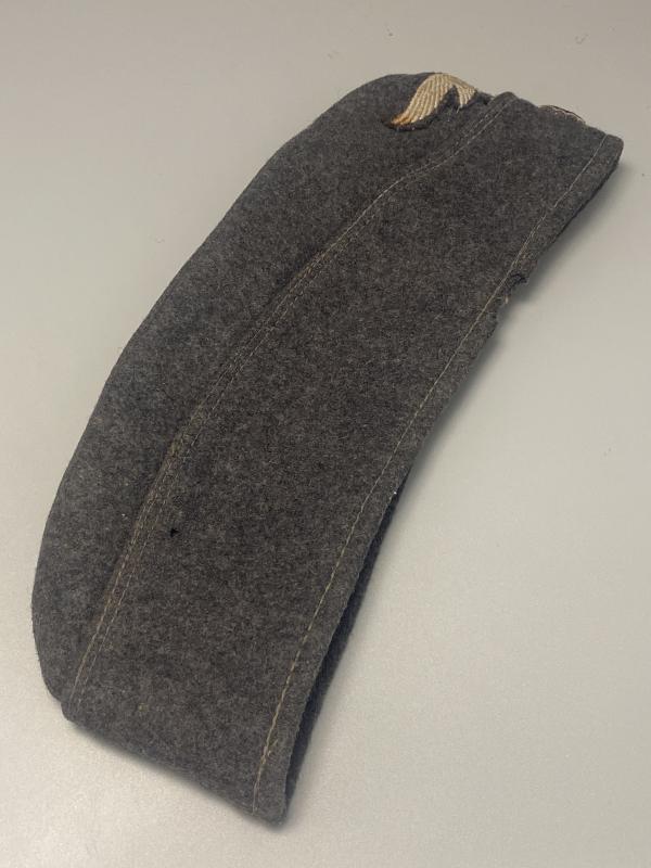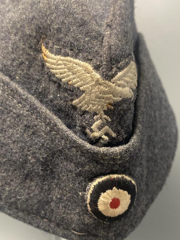 Original Luftwaffe enlisted man’s side cap. Complete with original factory applied insignia. Cap shows very small signs of wear. Some light moth nip. Size 57 with makers stamp inside as well as the manufacture year of 1942.