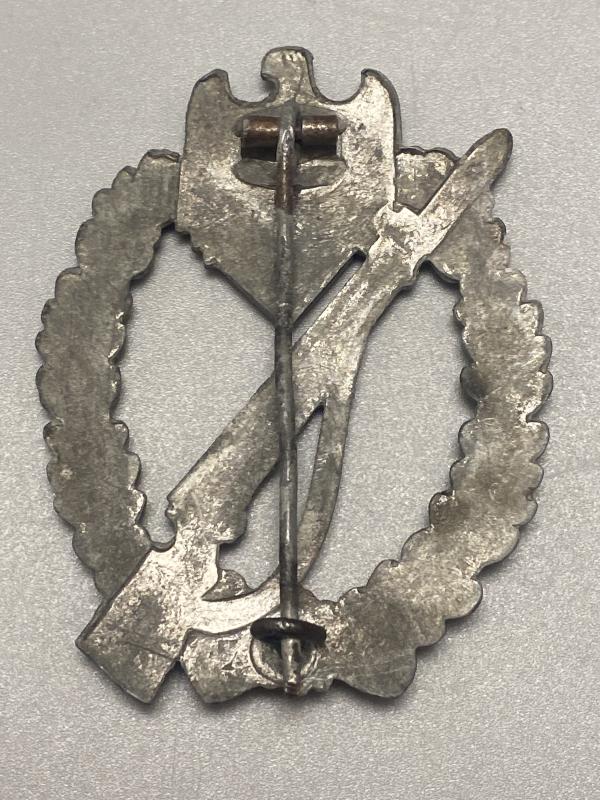 Original Infantry Assault badge in silver made by S&L. A good example with correct pin, hinge and hook set up attributed to this manufacturer.