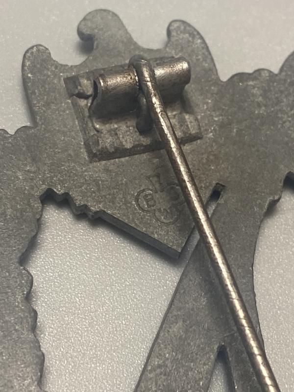 Original German infantry assault badge made by BSW. A good example with correct pin, hinge and hook set up attributed to this manufacturer.